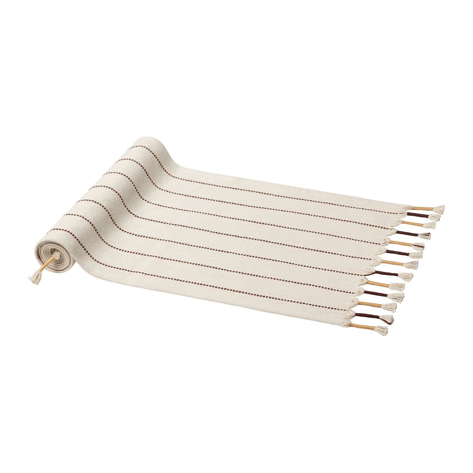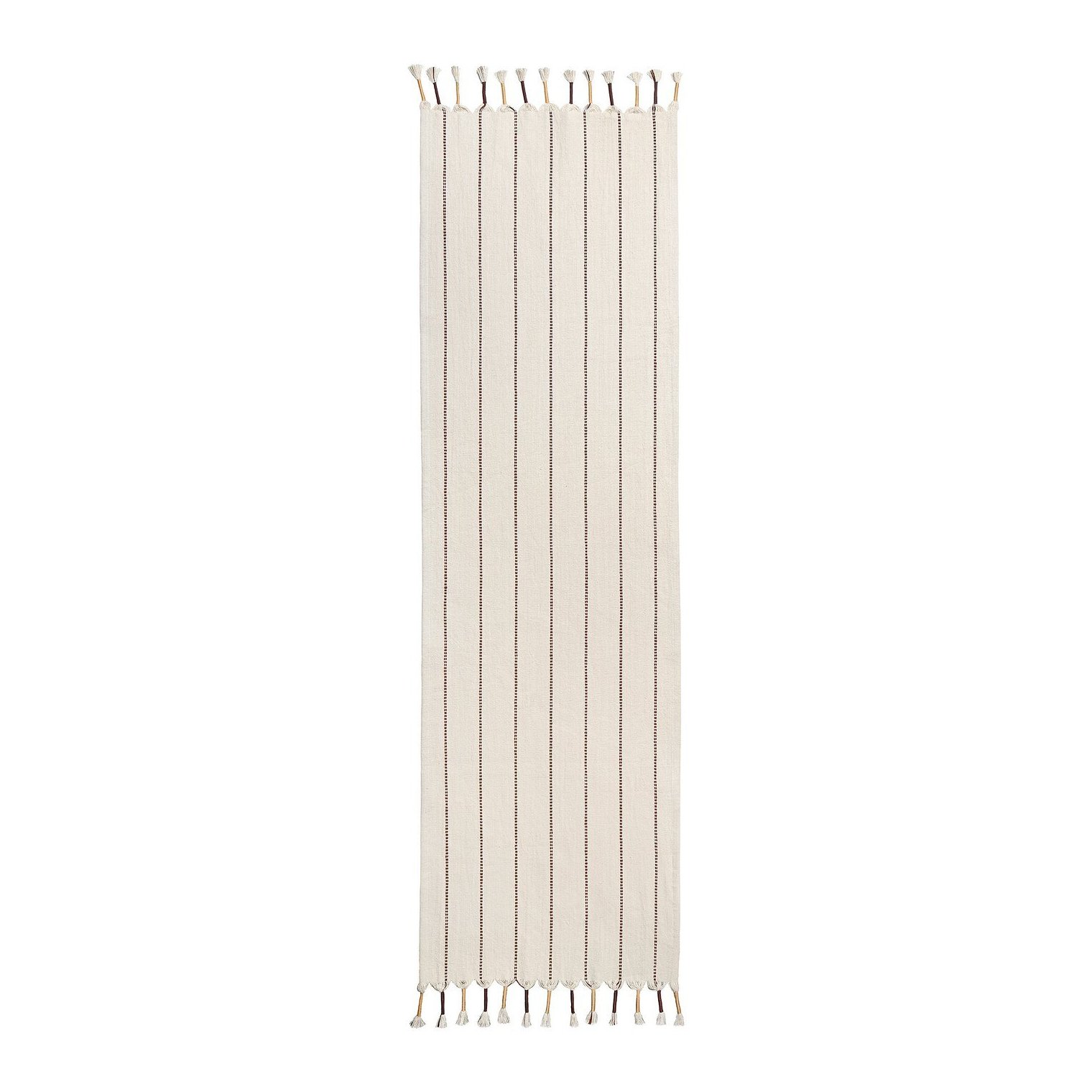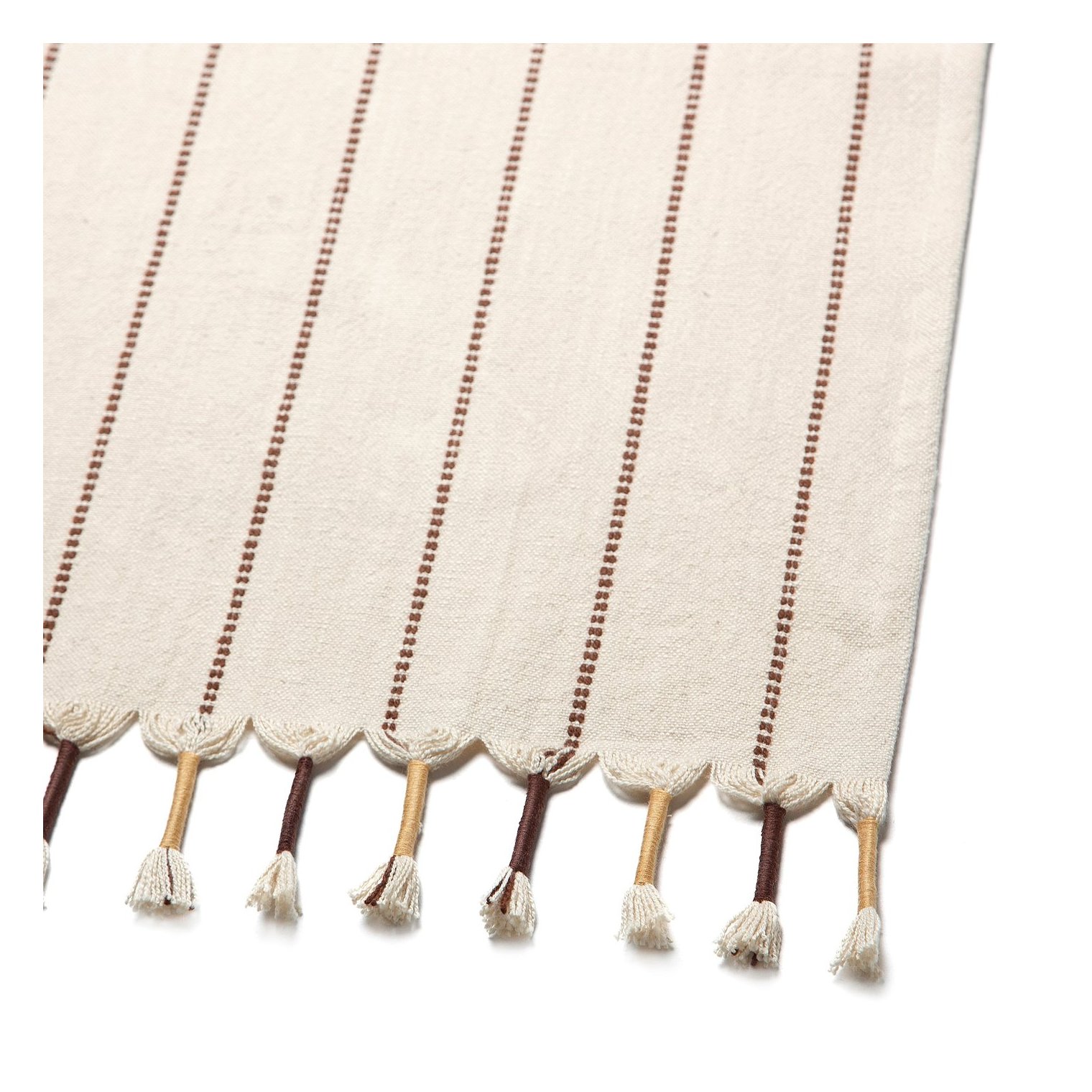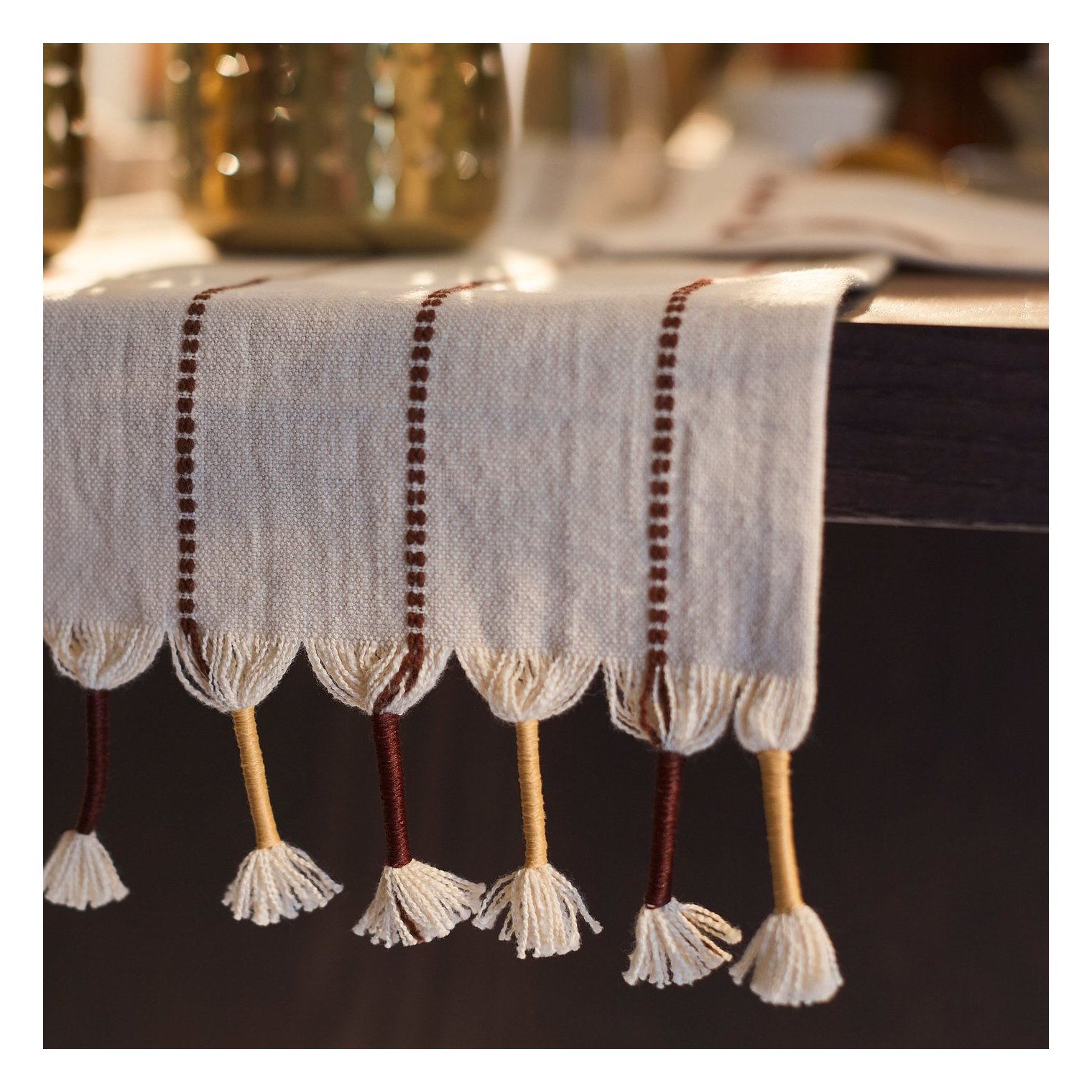 Скатертина-доріжка з більш товстої пряжі різних кольорів, що проходить поверхнею у вигляді швів і обробленою бахромою по коротких краях.