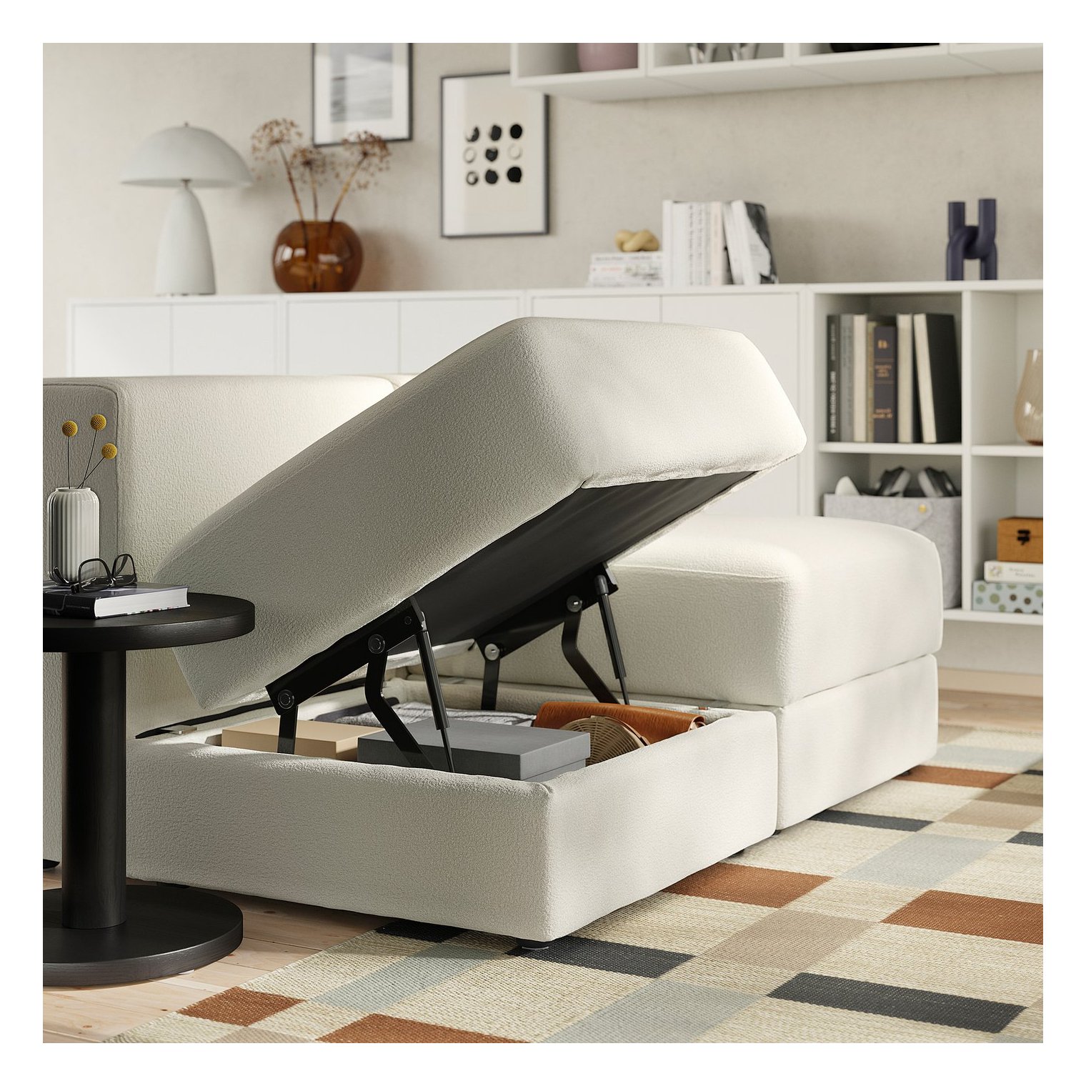 У просторому відділенні під сидінням шезлонгу та під сидінням можна зберігати такі речі, як пледи, ігри та коробки з дрібними предметами.