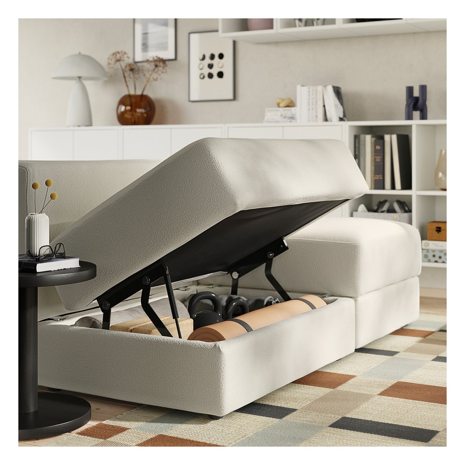 У просторому відділенні під сидінням шезлонгу та під сидінням можна зберігати такі речі, як пледи, ігри та коробки з дрібними предметами.