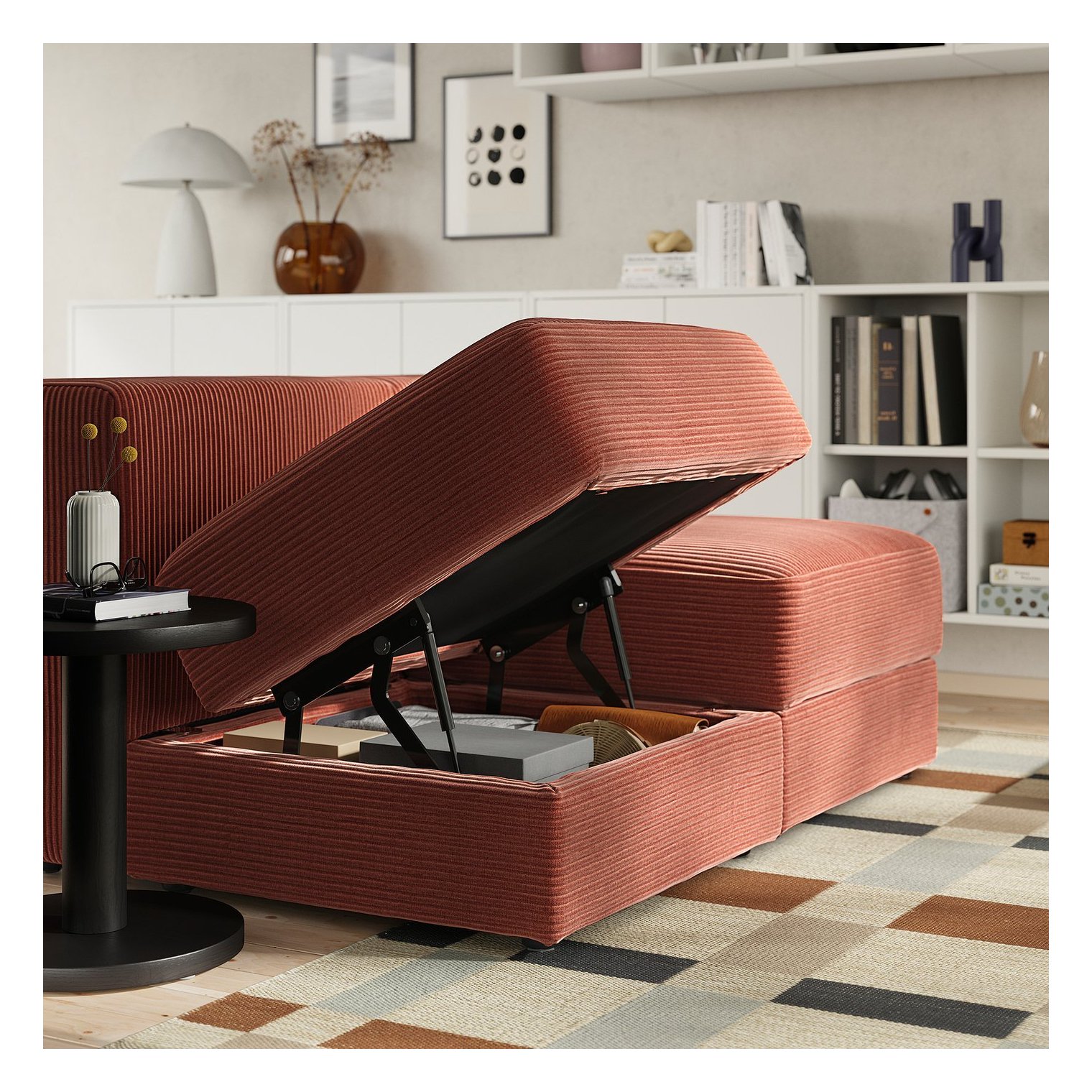 У просторому відділенні під сидінням шезлонгу та під сидінням можна зберігати такі речі, як пледи, ігри та коробки з дрібними предметами.