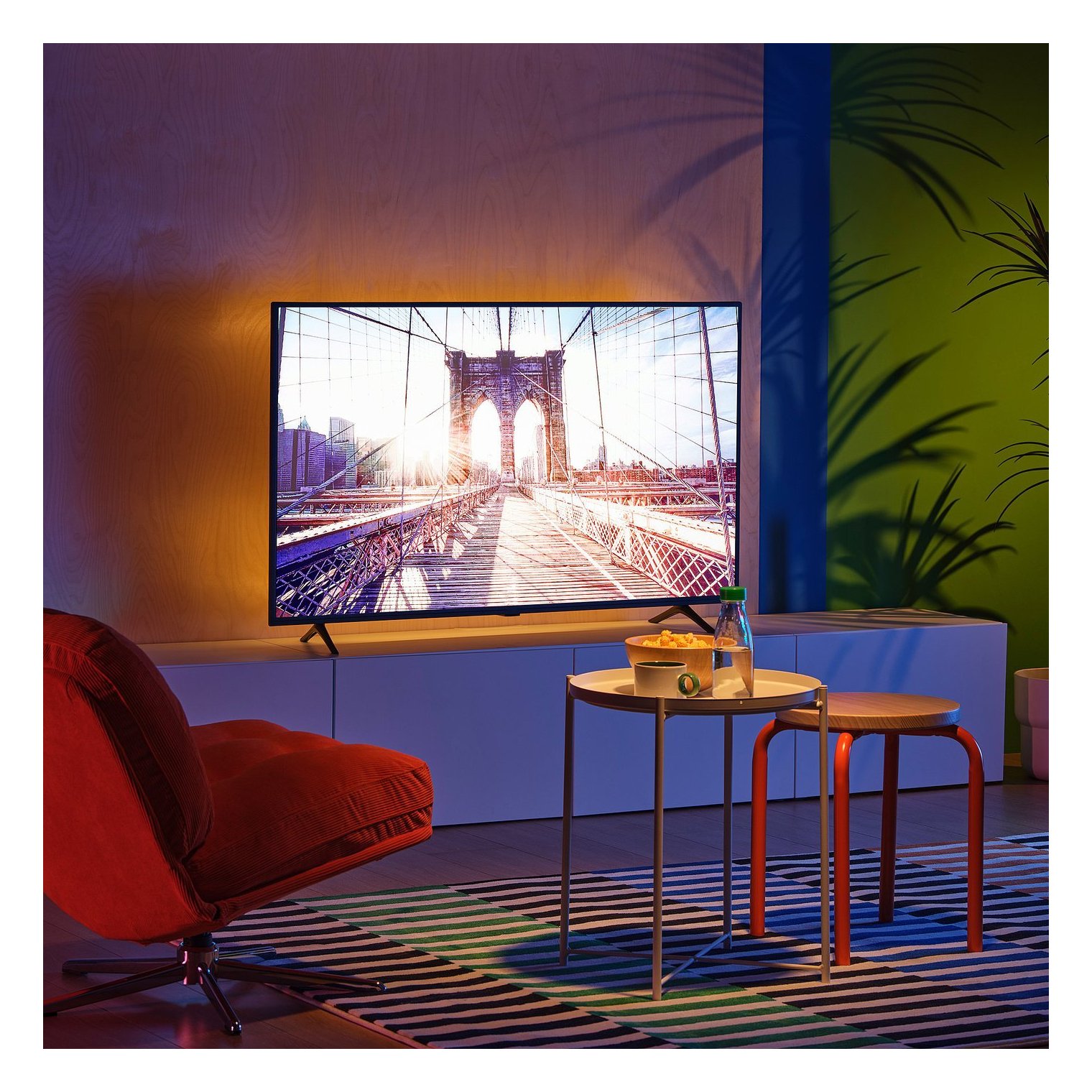 Світлодіодна стрічка є гнучкою, тому ви можете легко прикріпити її до задньої панелі телевізора або полиці.
