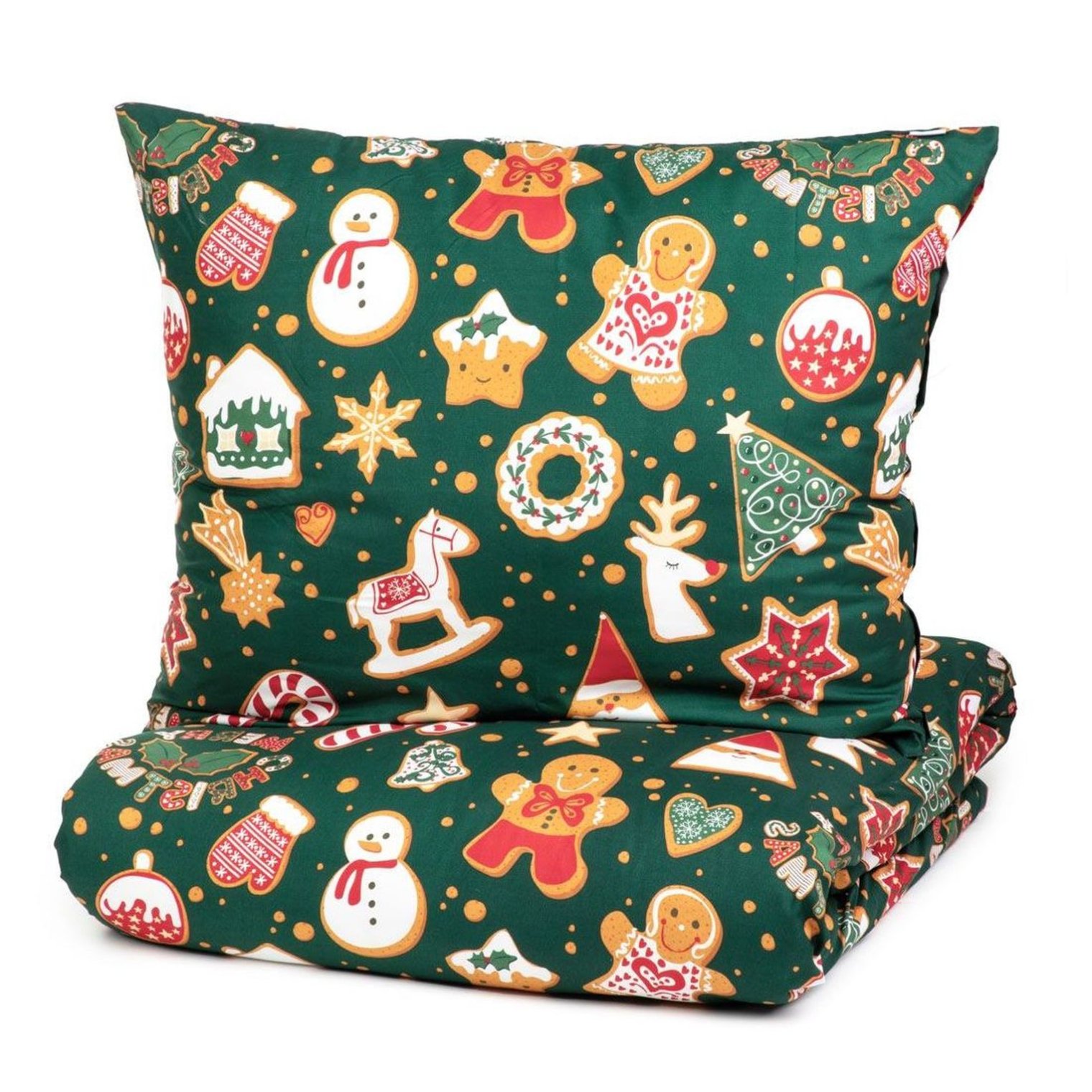 Різдвяний комплект постільної білизни GRINCHY складається з підковдри розміром 220 х 200 см (блискавка по довгій стороні 220 см) і двох наволочок розміром 70 х 80 см. Красивий візерунок із зображенням різдвяних елементів: Санта-Клаус, сніговики штрих у ваш інтер'єр.