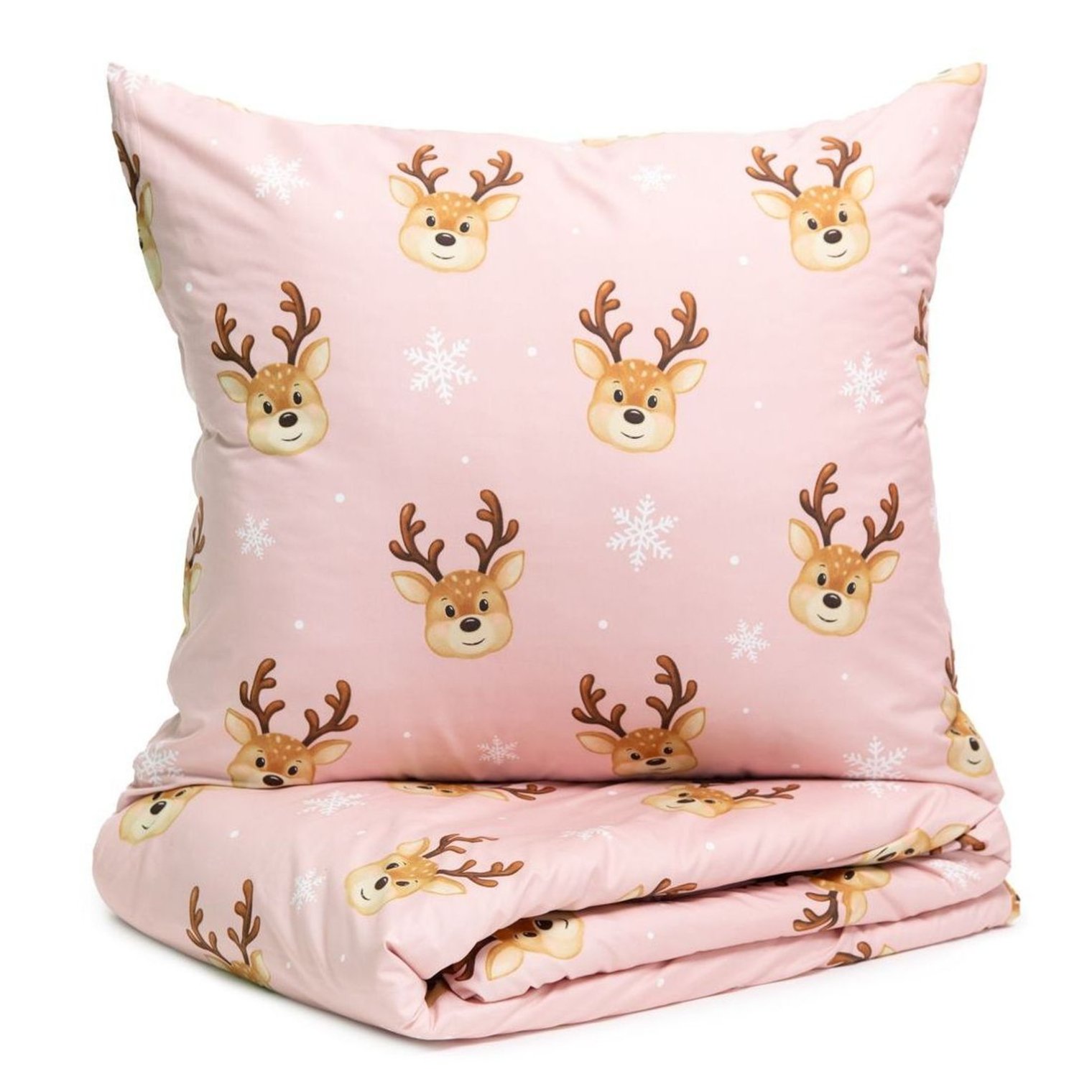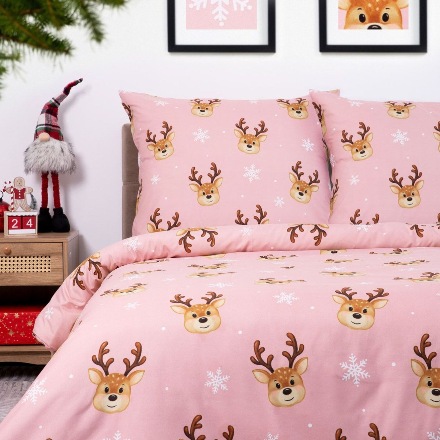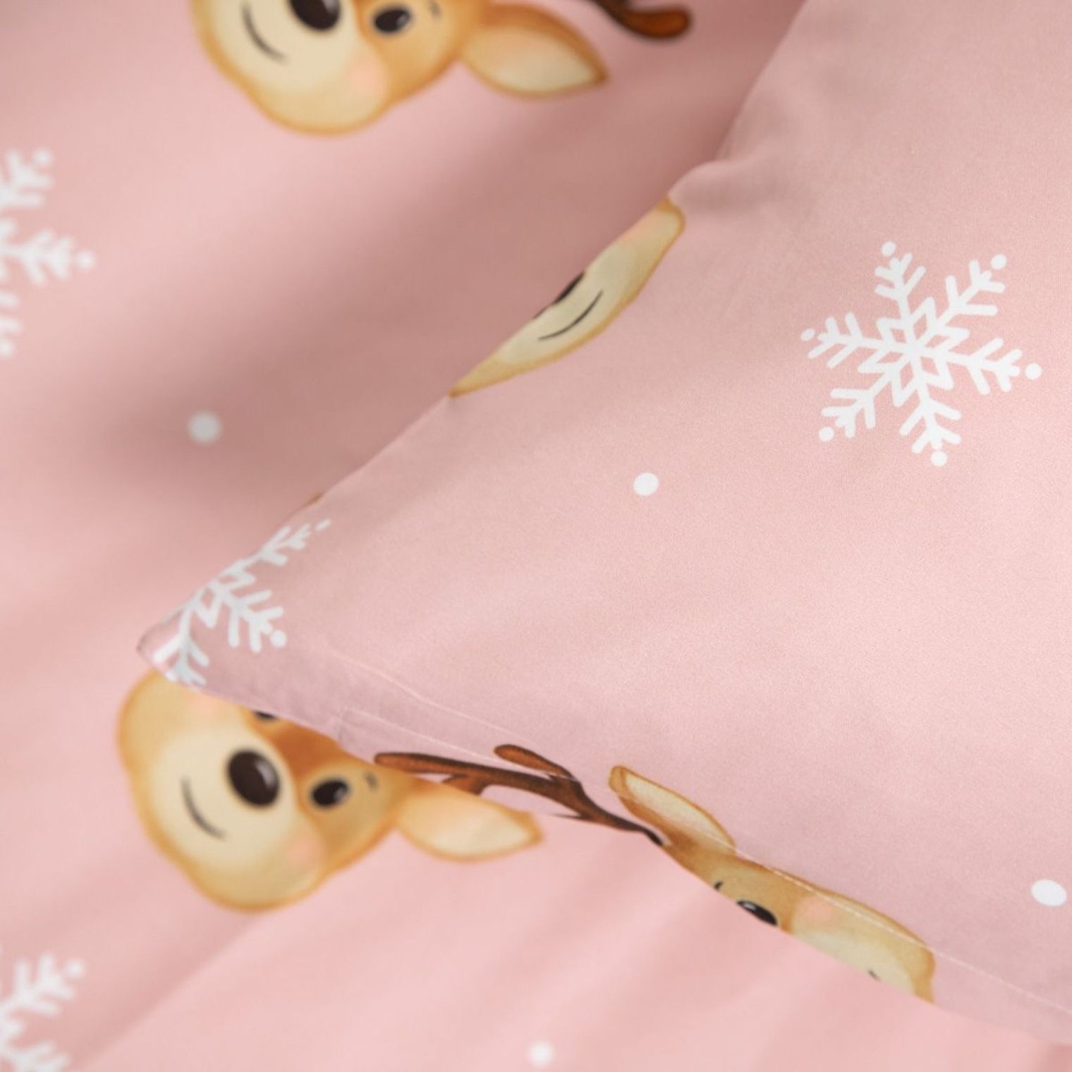 Постільна білизна з мікрофібри HOMLA IREMI принесе до вашої спальні радісний святковий настрій. Рожеві наволочки прикрашені малюнком усміхнених оленів та білих сніжинок. М'який дотик високоякісної мікрофібри забезпечить приємний сон, а чарівний візерунок підніме настрій вранці та допоможе розпочати день із користю. У комплект входять підковдра розміром 160 х 200 см і дві наволочки розміром 70 х 80 см.