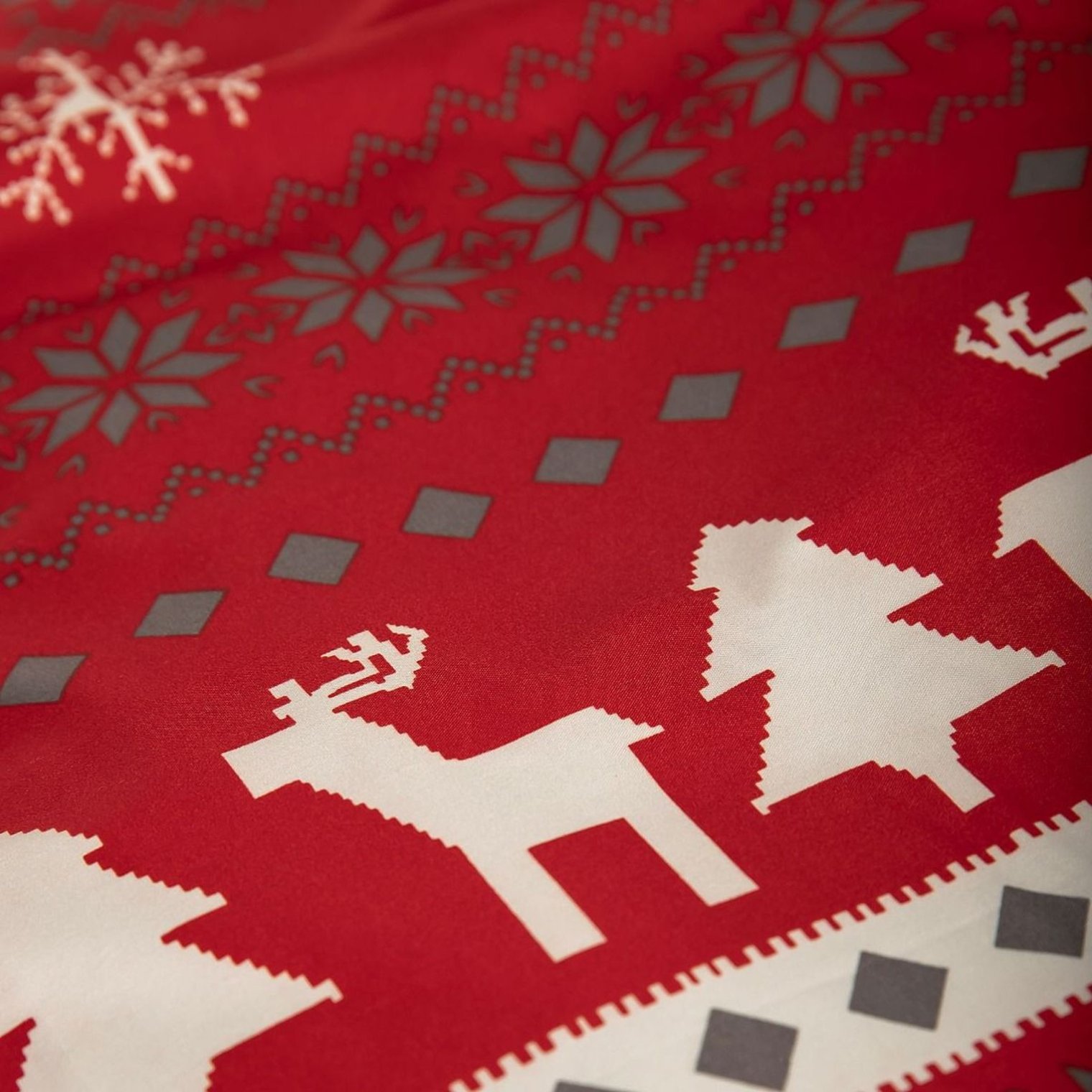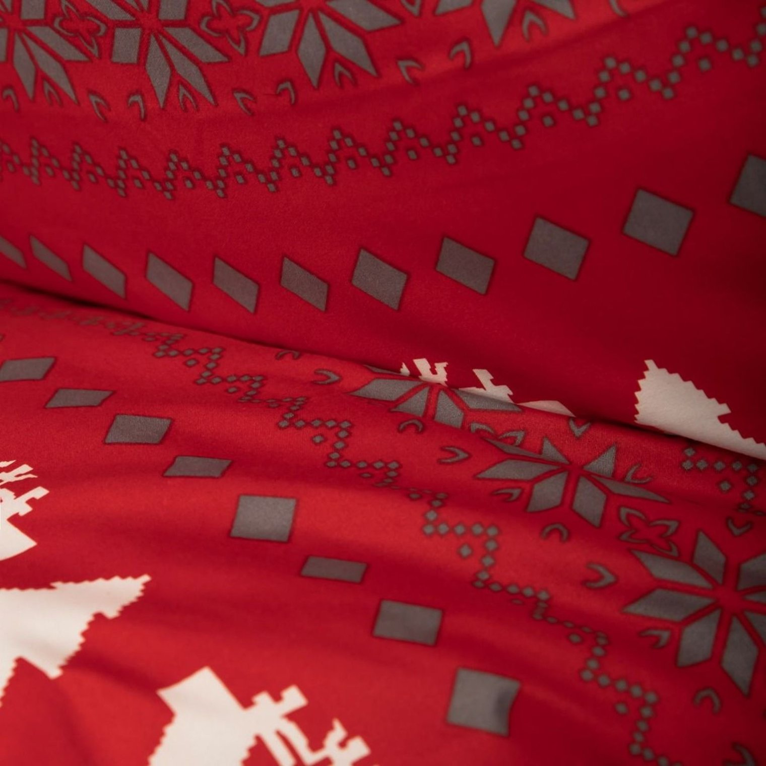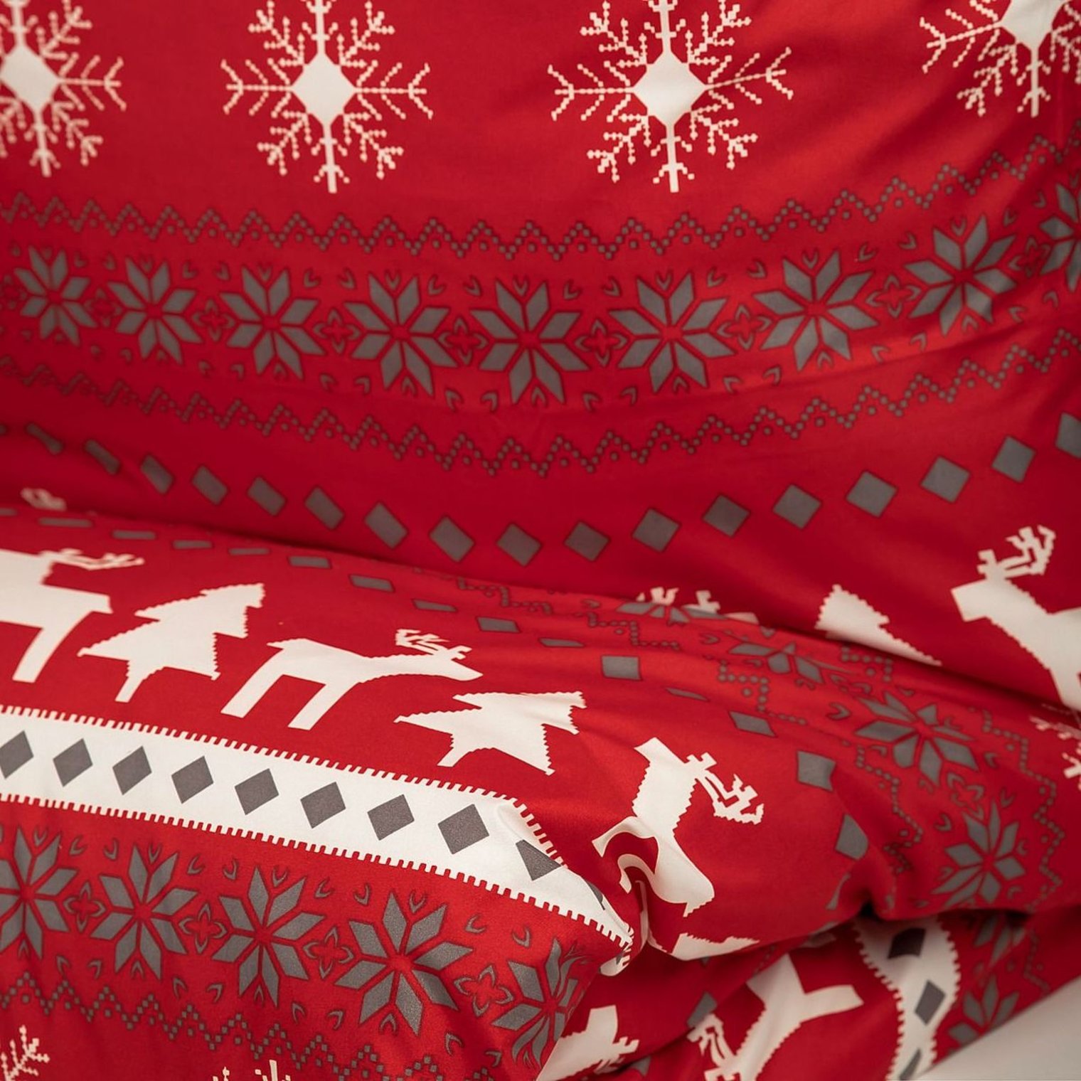 Колекція TRADITIONAL CHRISTMAS виконана в класичній різдвяній кольоровій гамі - поєднанні насиченого зеленого, білого та червоного. Яскраві візерунки, включаючи сніжинки, ялинки та оленів, розташовані на червоному тлі. В комплект входять великий підковдра (160x200 см) і дві наволочки розміром 70x80 см.