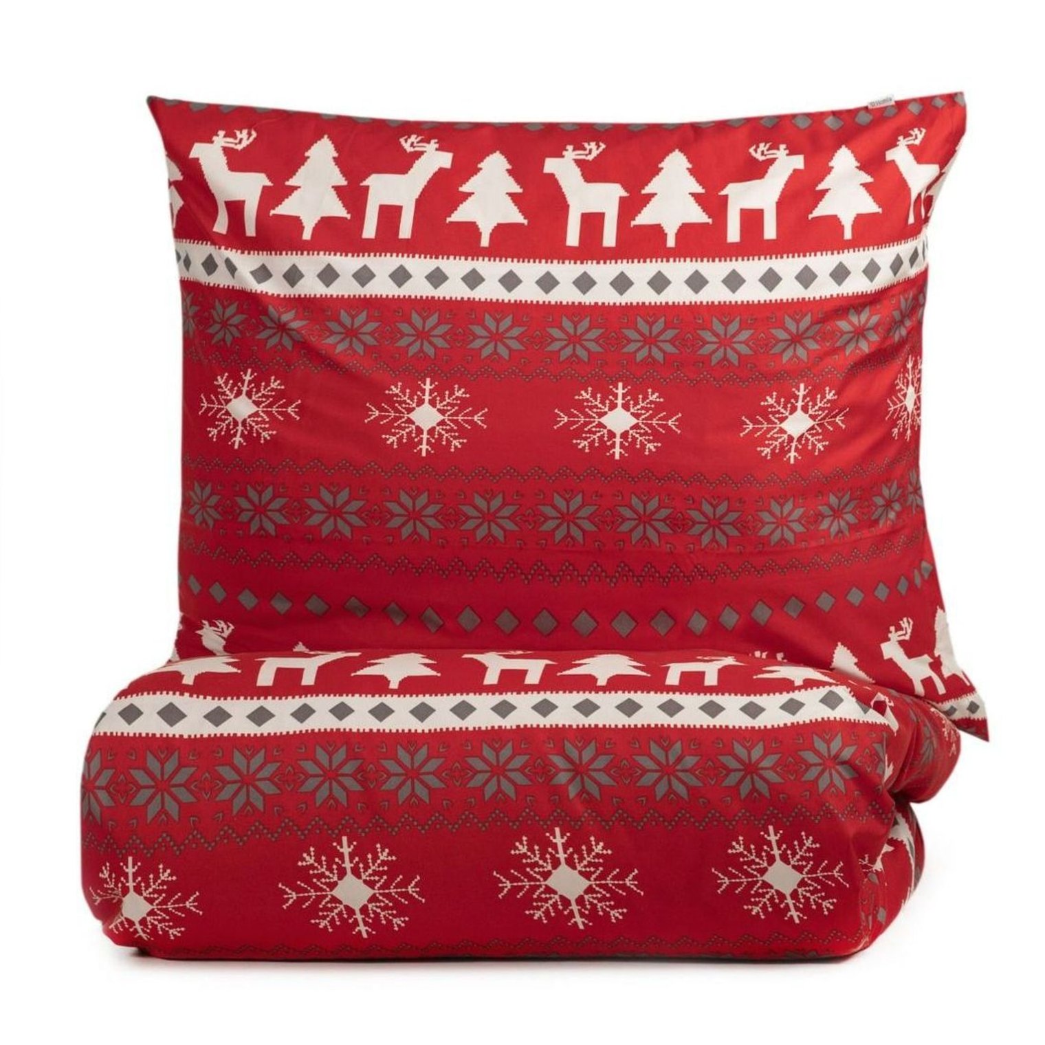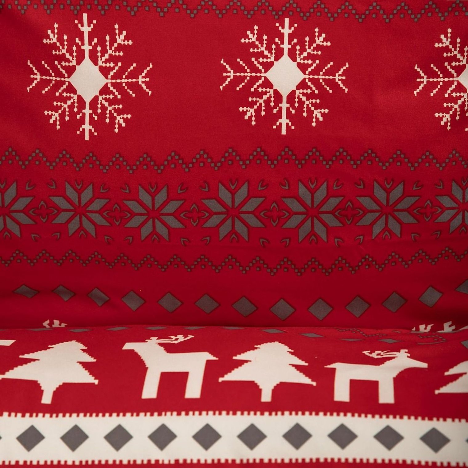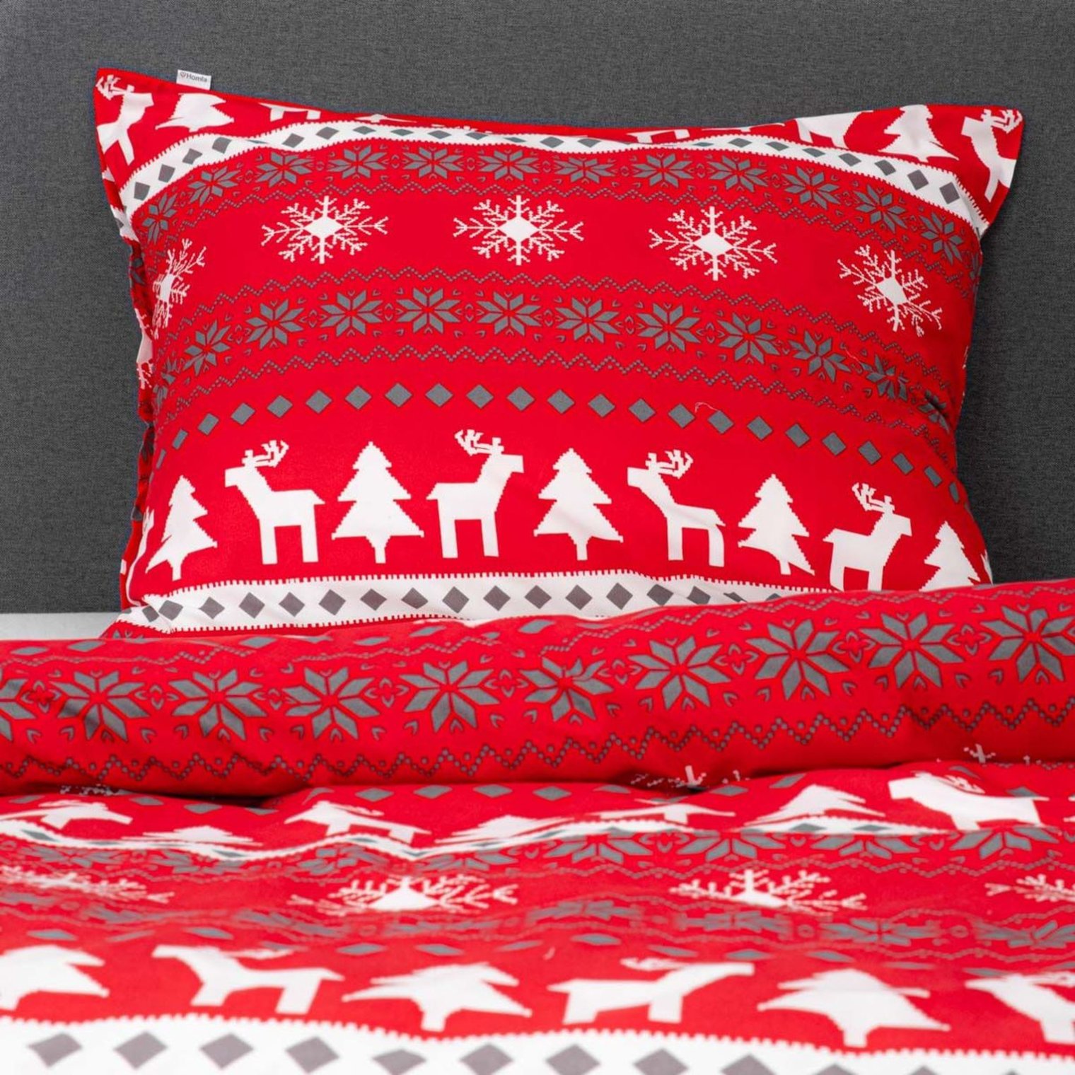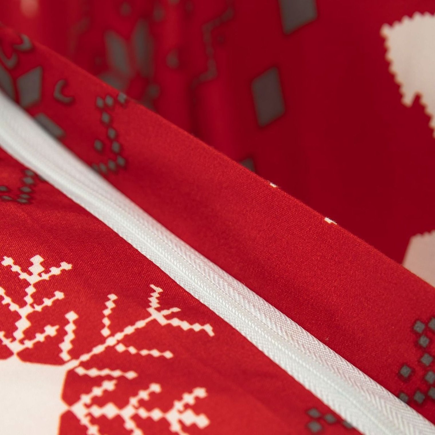 Колекція TRADITIONAL CHRISTMAS виконана в класичній різдвяній кольоровій гамі - поєднанні насиченого зеленого, білого та червоного. Яскраві візерунки, включаючи сніжинки, ялинки та оленів, розташовані на червоному тлі. В комплект входять великий підковдра (160x200 см) і дві наволочки розміром 70x80 см.