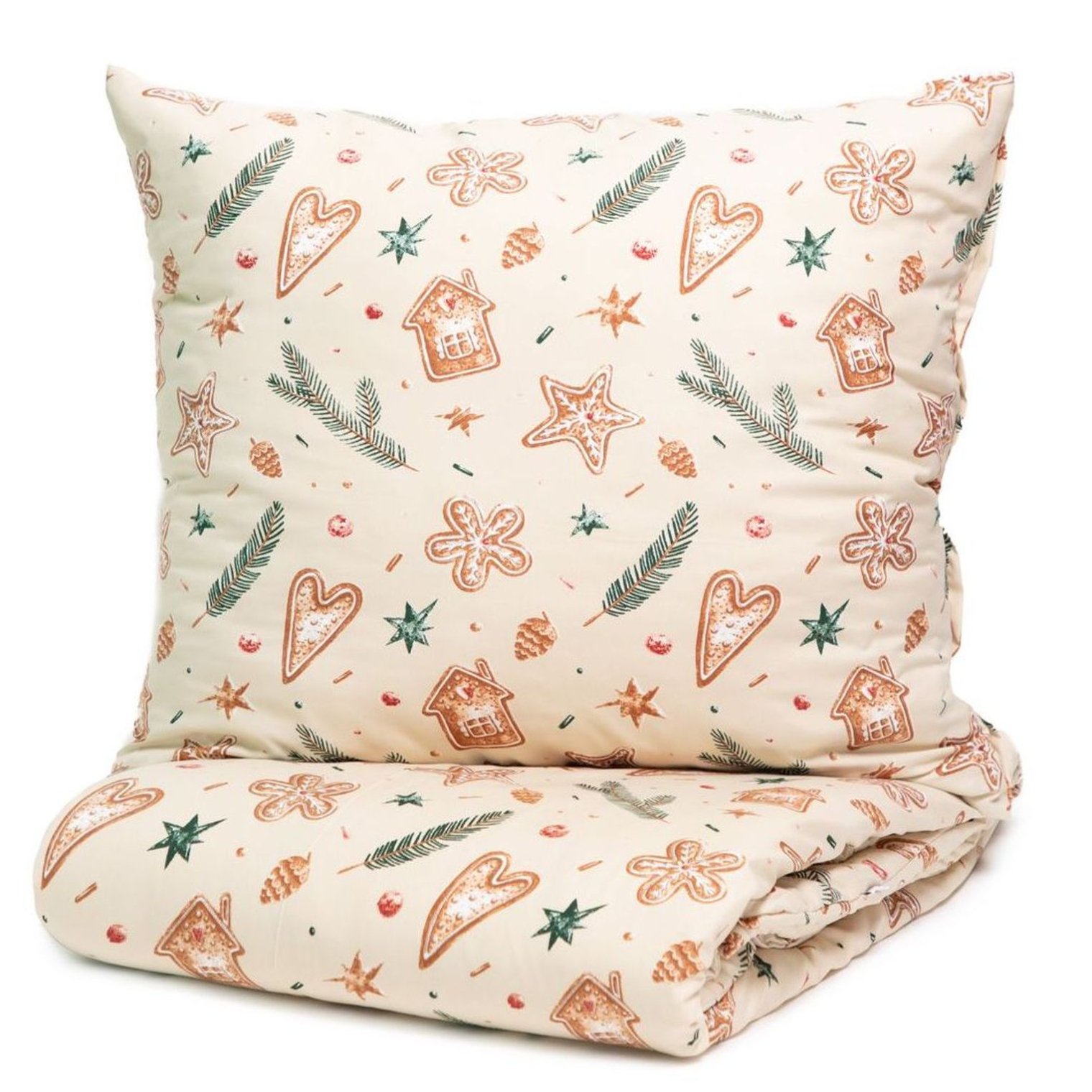 Чарівний комплект постільної білизни ROSEMARY включає підковдра розміром 160 х 200 см і дві наволочки розміром 70 х 80 см. Його милий візерунок з імбирними пряниками, шишками та зірками створить чарівну атмосферу, яка миттєво наповнить всю кімнату свята.
