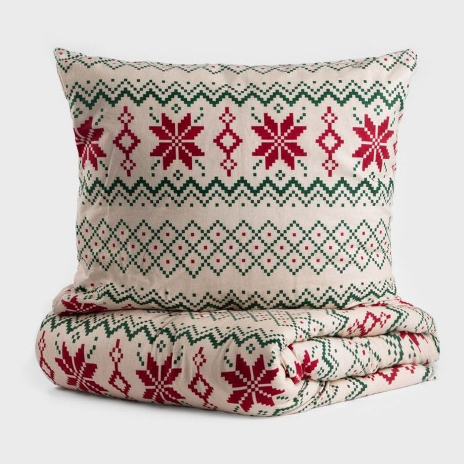 Постільна білизна WINTEY складається з підковдри розміром 140 x 200 см та наволочки розміром 70 x 80 см. Візерунок та забарвлення постільної білизни натхненні Різдвом та стануть чудовим доповненням до вашого святкового інтер'єру. Цей комплект призначений для невеликих та середніх спалень, але також відмінно підійде для гостьових, дитячих та підліткових кімнат. Це чудовий різдвяний подарунок.