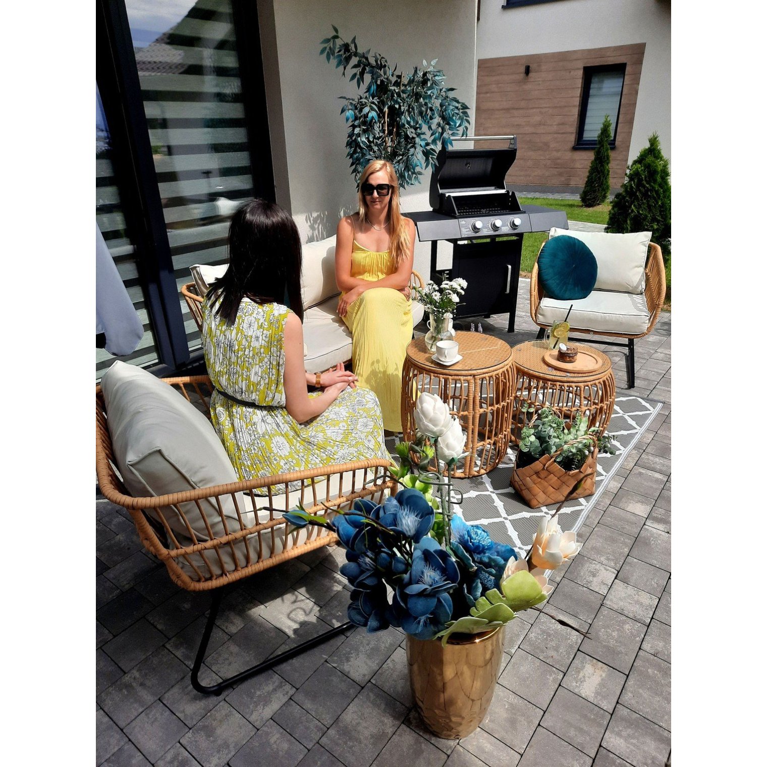 Елегантний та функціональний комплект садових меблів, який ідеально підійде для вашої тераси, саду чи зони відпочинку. Поєднання міцної оцинкованої сталевої конструкції із стійким до атмосферних впливів техноротангом гарантує, що меблі прослужать довгі роки. Зручні подушки забезпечують комфорт використання, а два столики різної висоти додають функціональності.