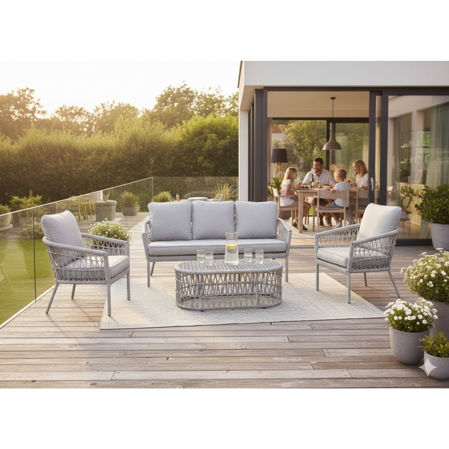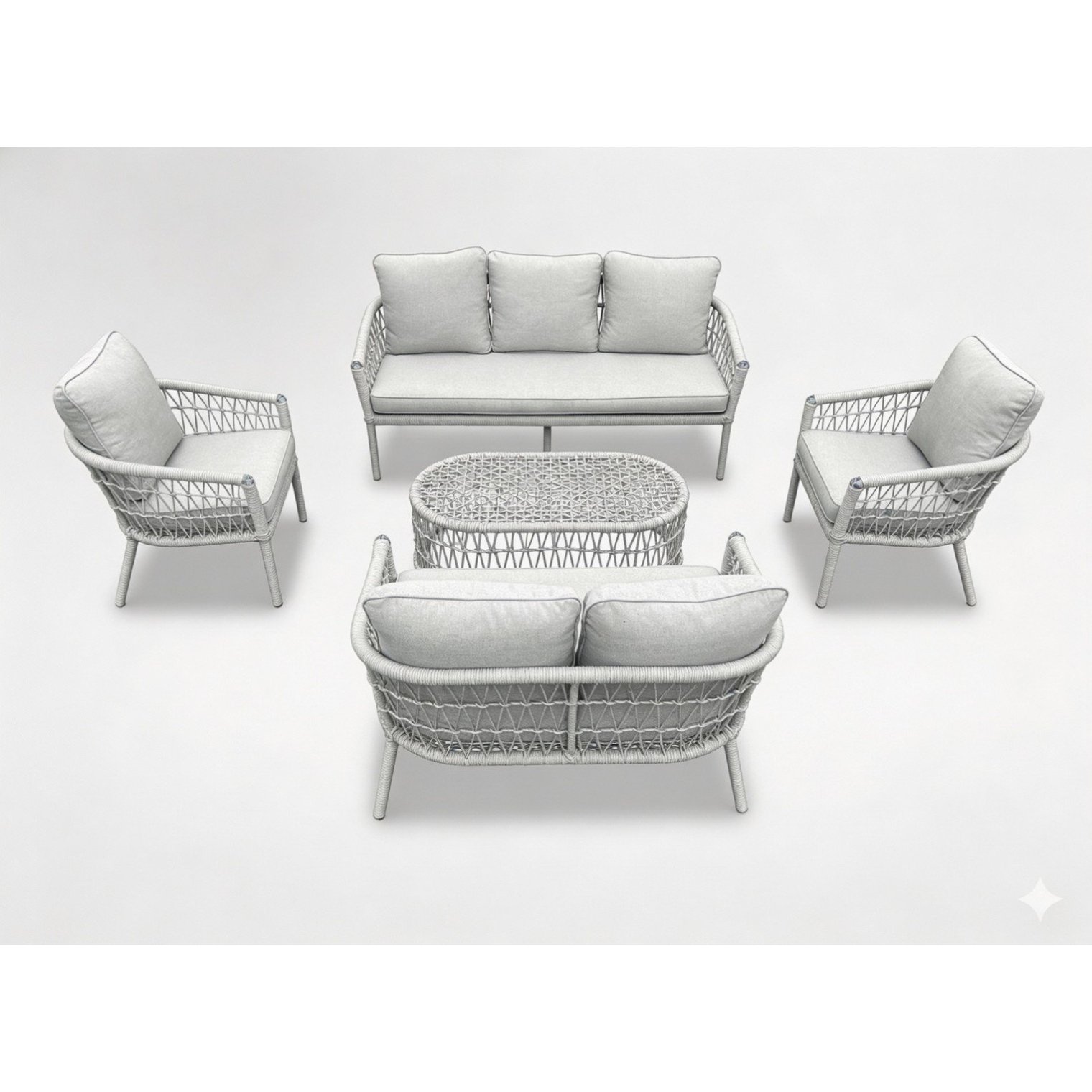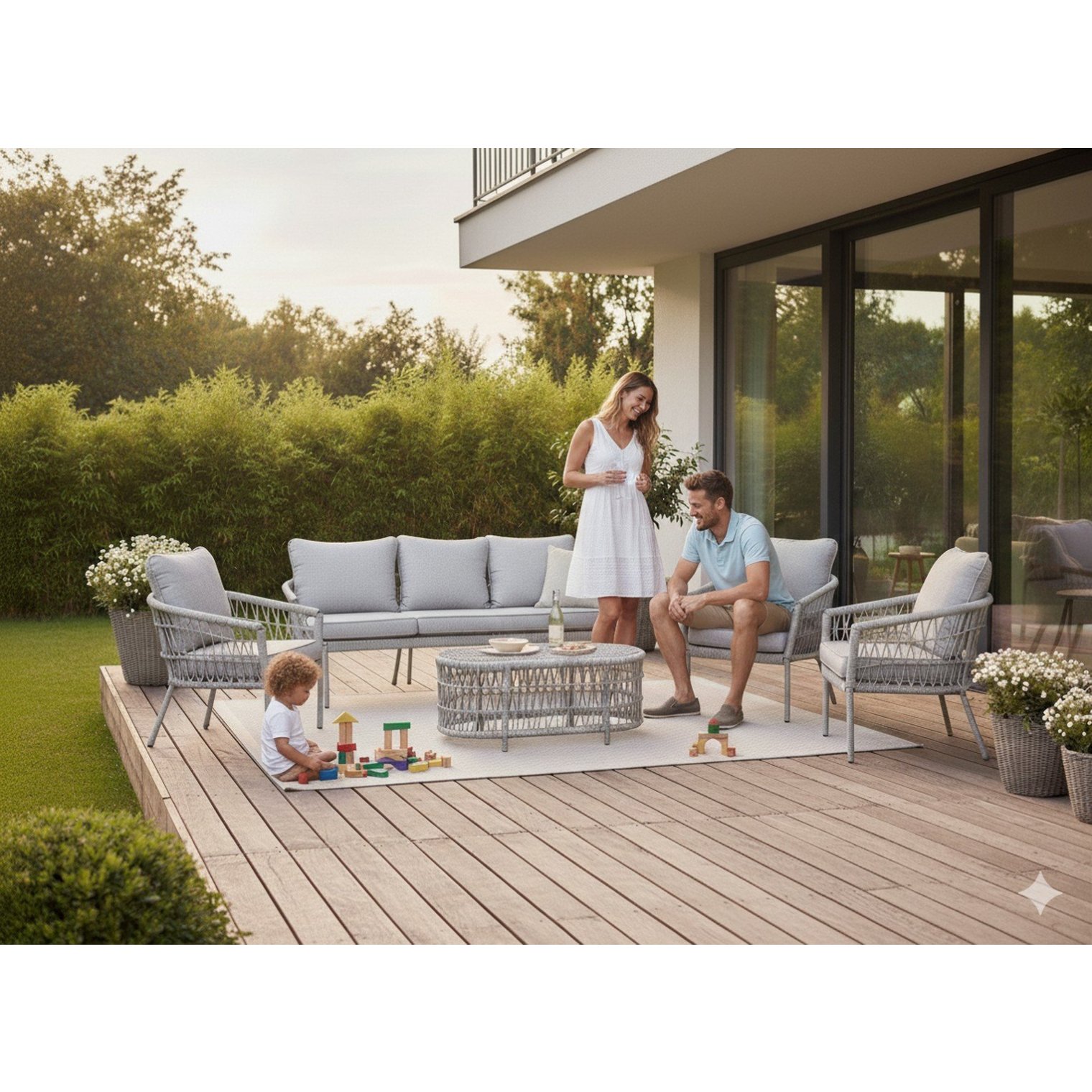 Цей комплект диванів для відпочинку на відкритому повітрі поєднує сучасний дизайн і комфорт, що робить його ідеальним доповненням до будь-якого саду або патіо. У комплект входять тримісний диван, двомісний диван, два крісла та журнальний столик, що пропонує достатньо місця для зустрічей. Погодостійкі матеріали гарантують, що він витримає вплив зовнішніх факторів, а м'які подушки забезпечать розслаблення у сонячні дні. Стіл додає нотку елегантності, ідеально підходить для зберігання напоїв чи декору. Незалежно від того, чи розважаєте ви гостей чи насолоджуєтеся сімейним часом, цей комплект прикрасить відкриті простори стилем та довговічністю, забезпечуючи ідеальне поєднання функціональності та естетики.