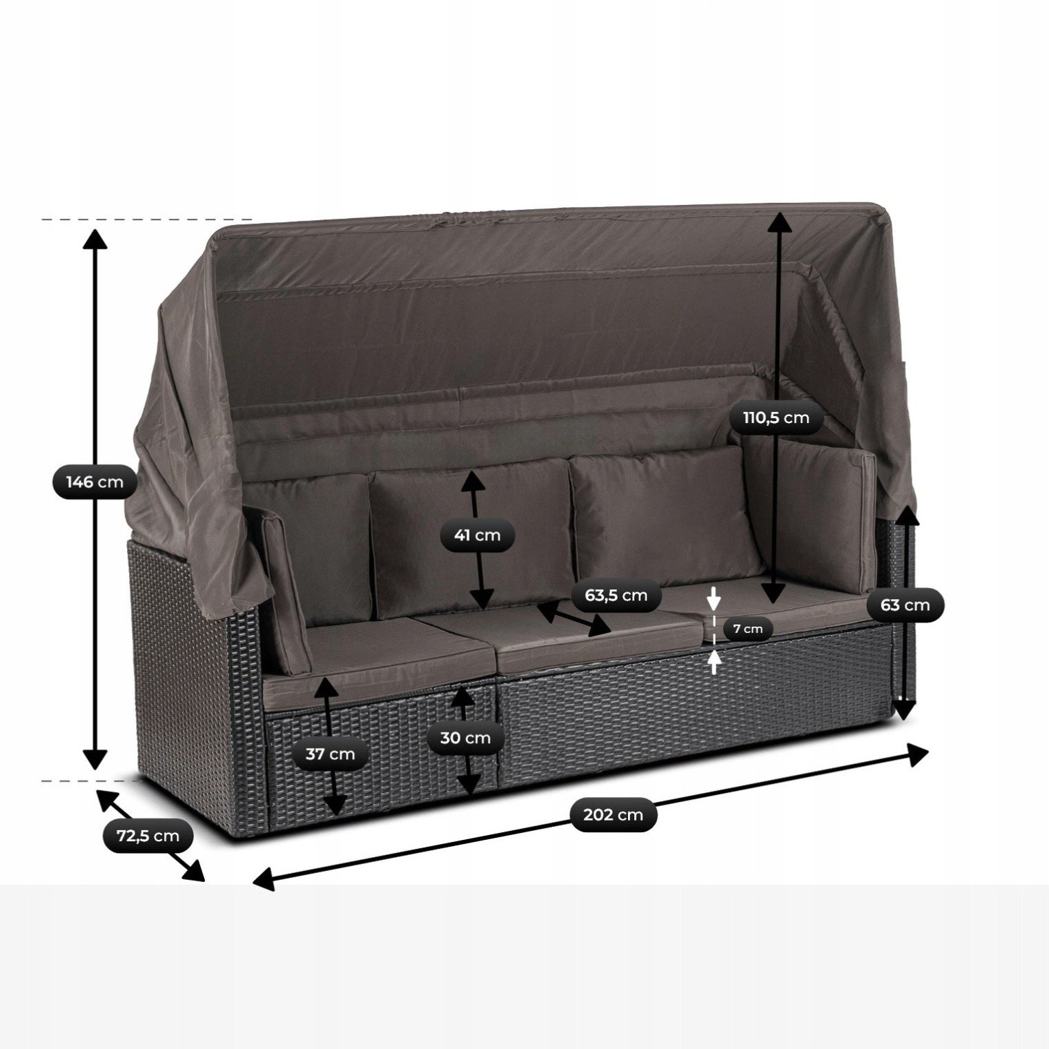 - Диван з висувним навісом - це зручне місце для відпочинку, що ідеально підходить для повсякденного розслаблення. Функціональний навіс дозволяє легко створити приємну тінь у сонячні дні.