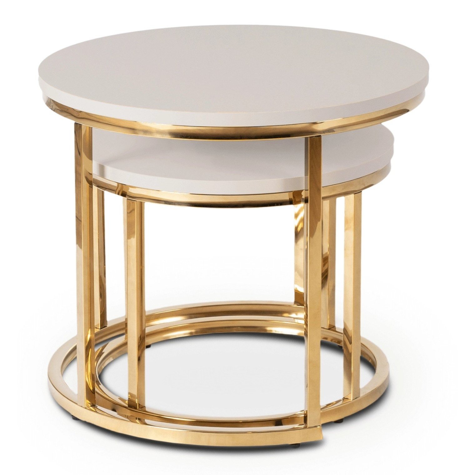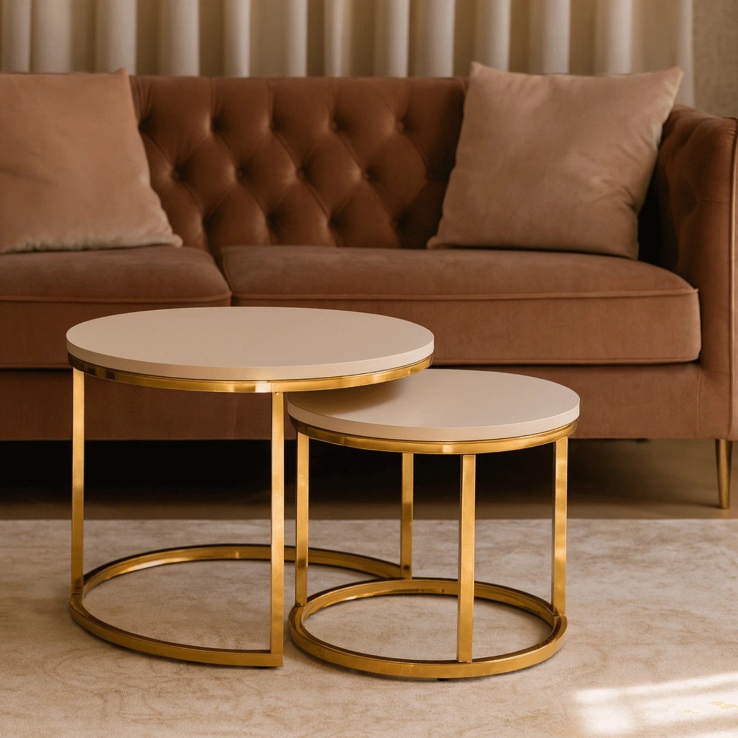 Мрієте надати своїй вітальні розкішний вигляд? Комплект журнальних столиків Apulia одразу ж приверне увагу. Два круглі столики різних розмірів пропонують повну свободу в розстановці: ви можете розмістити їх окремо, зрушити разом або засунути один під одним для економії місця.