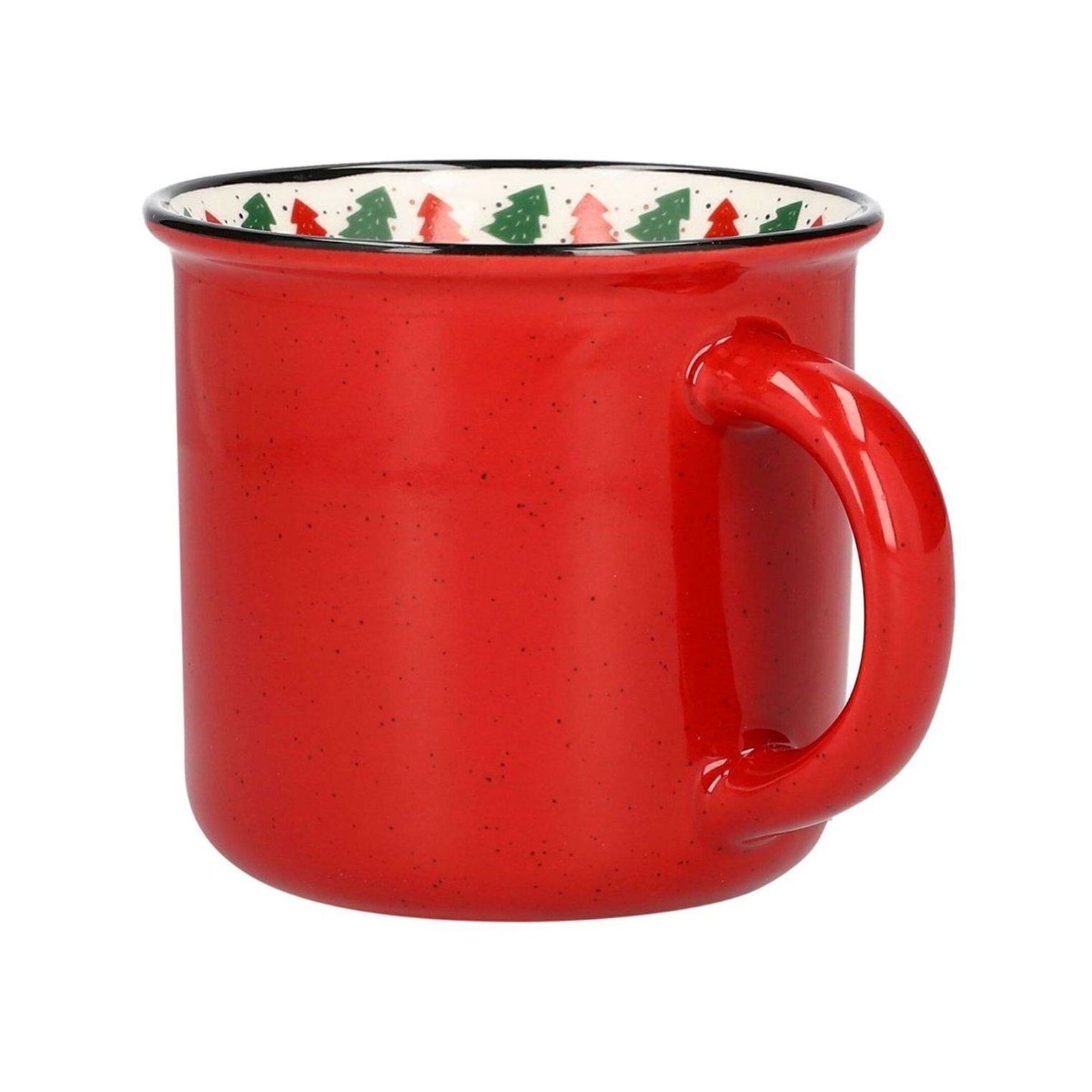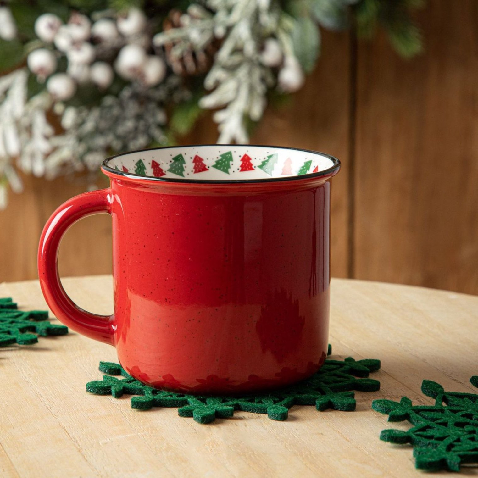 Цей порцеляновий кухоль виглядає так, ніби зроблений з традиційної кераміки, додавши затишку і сільського колориту будь-якій кухні або їдальні. Цей червоний порцеляновий кухоль об'ємом 0,35 літра пофарбований зовні в червоний колір, а всередині - в білий. Усередині по краю знаходиться різдвяний орнамент — ялинка.