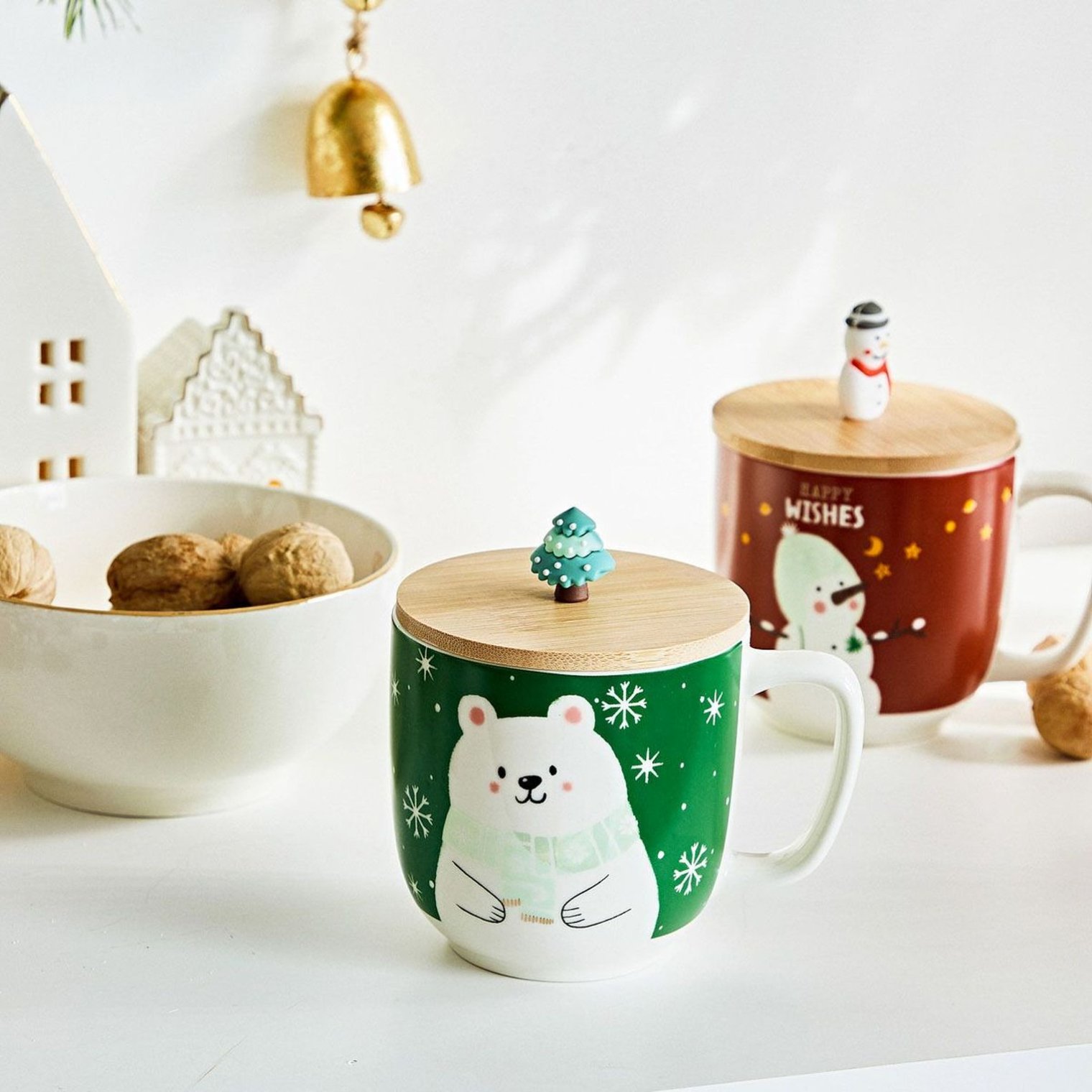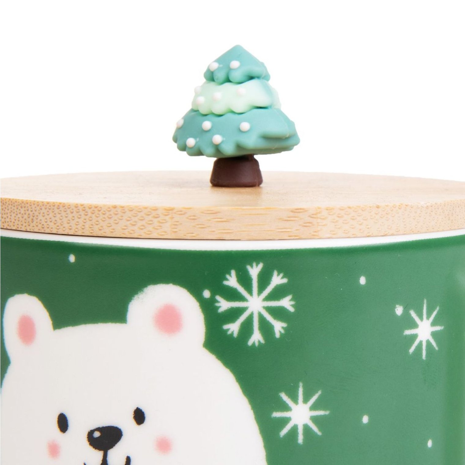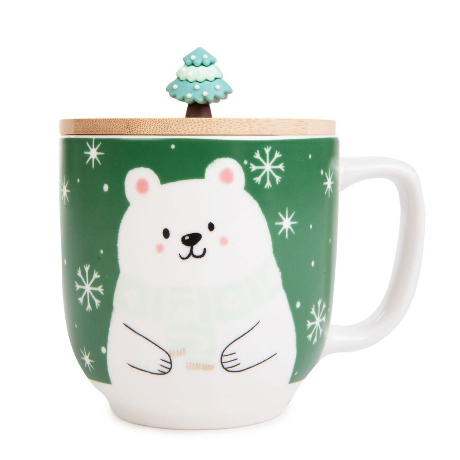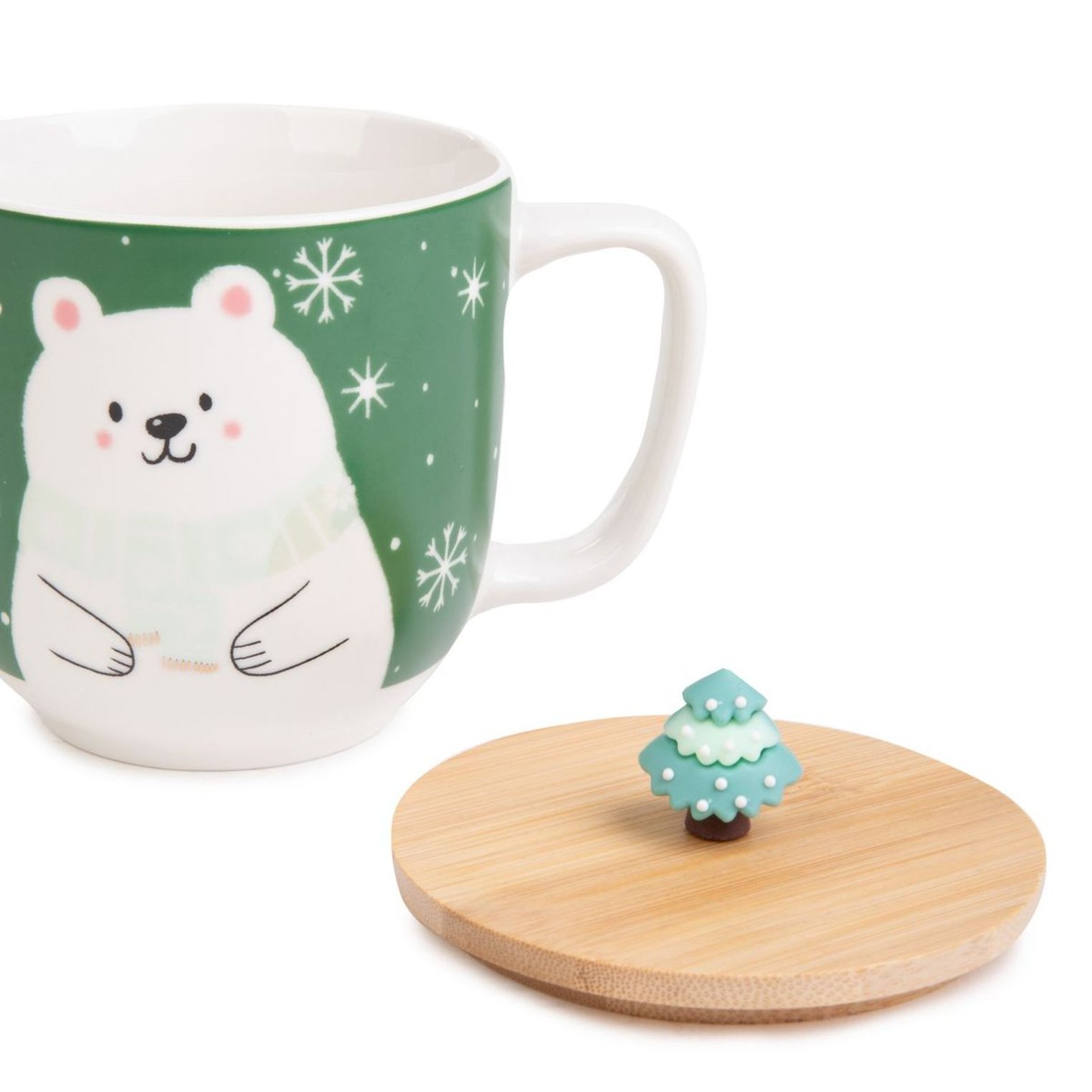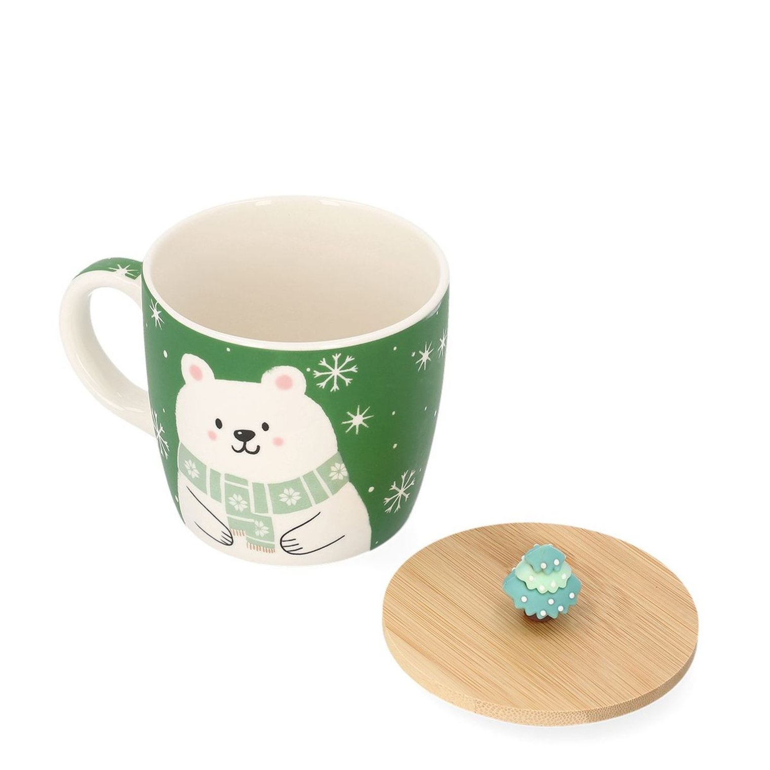 Кухоль оснащений дерев'яною кришкою з ручкою у вигляді різдвяної ялинки. Кухоль Modly зеленого кольору прикрашена зображенням білого плюшевого ведмедика. Велика ручка забезпечує зручне захоплення.