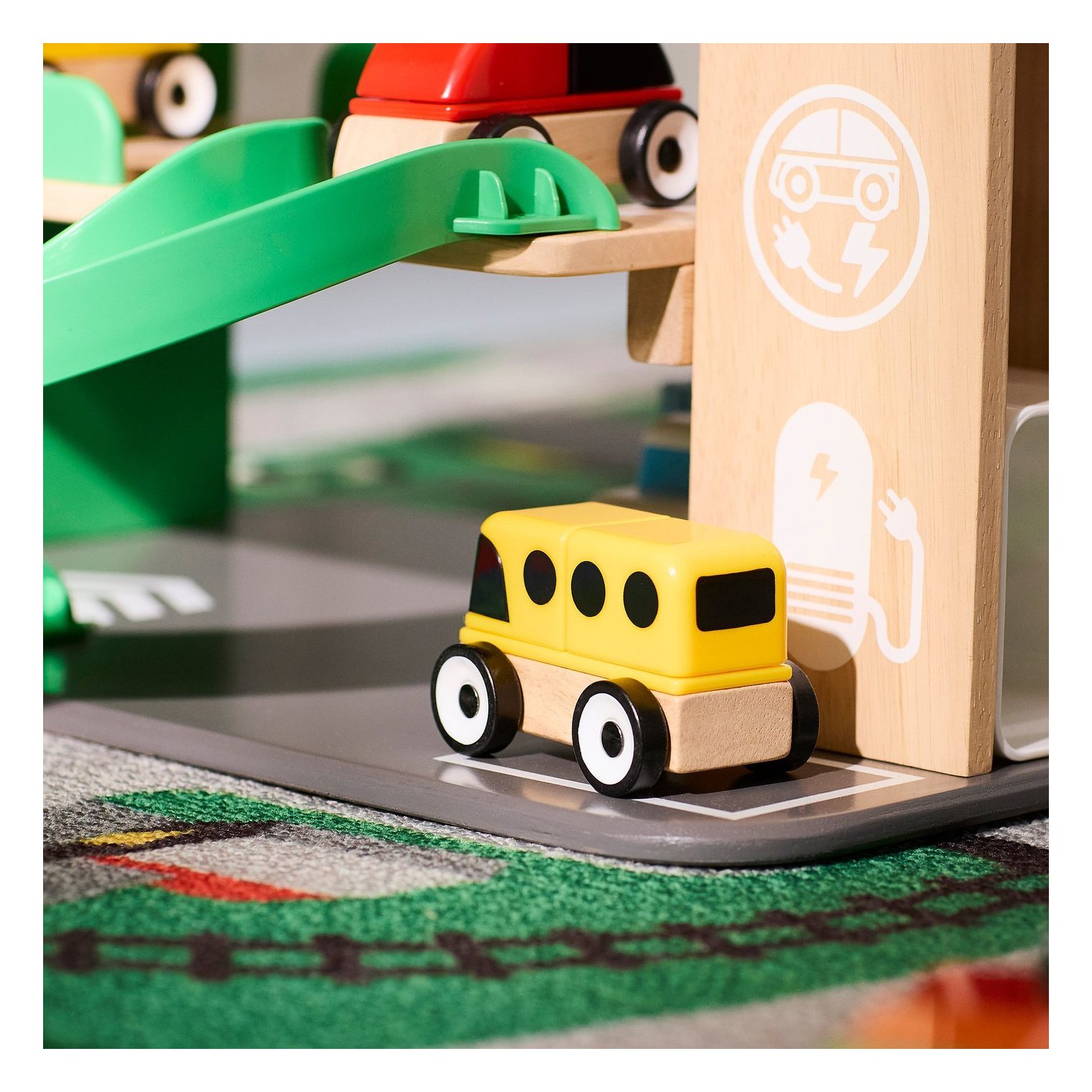 З'їжджайте пандусом, заряджайте машину, ремонтуйте її в майстерні або відвозіть на автомийку — захоплюючі деталі, які надихають на веселощі і навчання. Потрібен відпочинок? Скористайтеся витягом і припаркуйте машину на деякий час!