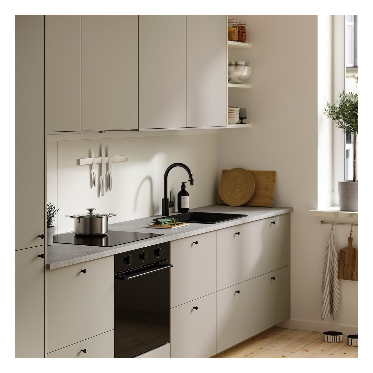 Стійкий до високих температур, води, жиру та бруду; може бути встановлений на стіні за кухонною стільницею та варильною панеллю (крім газової плити).