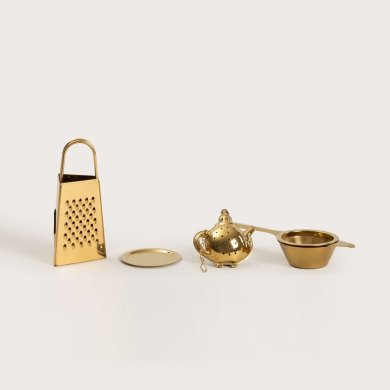 Набір чайного приладдя JALO спрощує приготування ароматних настоїв та робить щоденний чайний ритуал приємнішим. У набір входять три практичні аксесуари: терка для імбиру, чайник для заварювання у формі невеликого чайника і ситечко. Золота обробка надає набору елегантного вигляду і робить його прекрасним доповненням до сервіровки чаю для гостей.