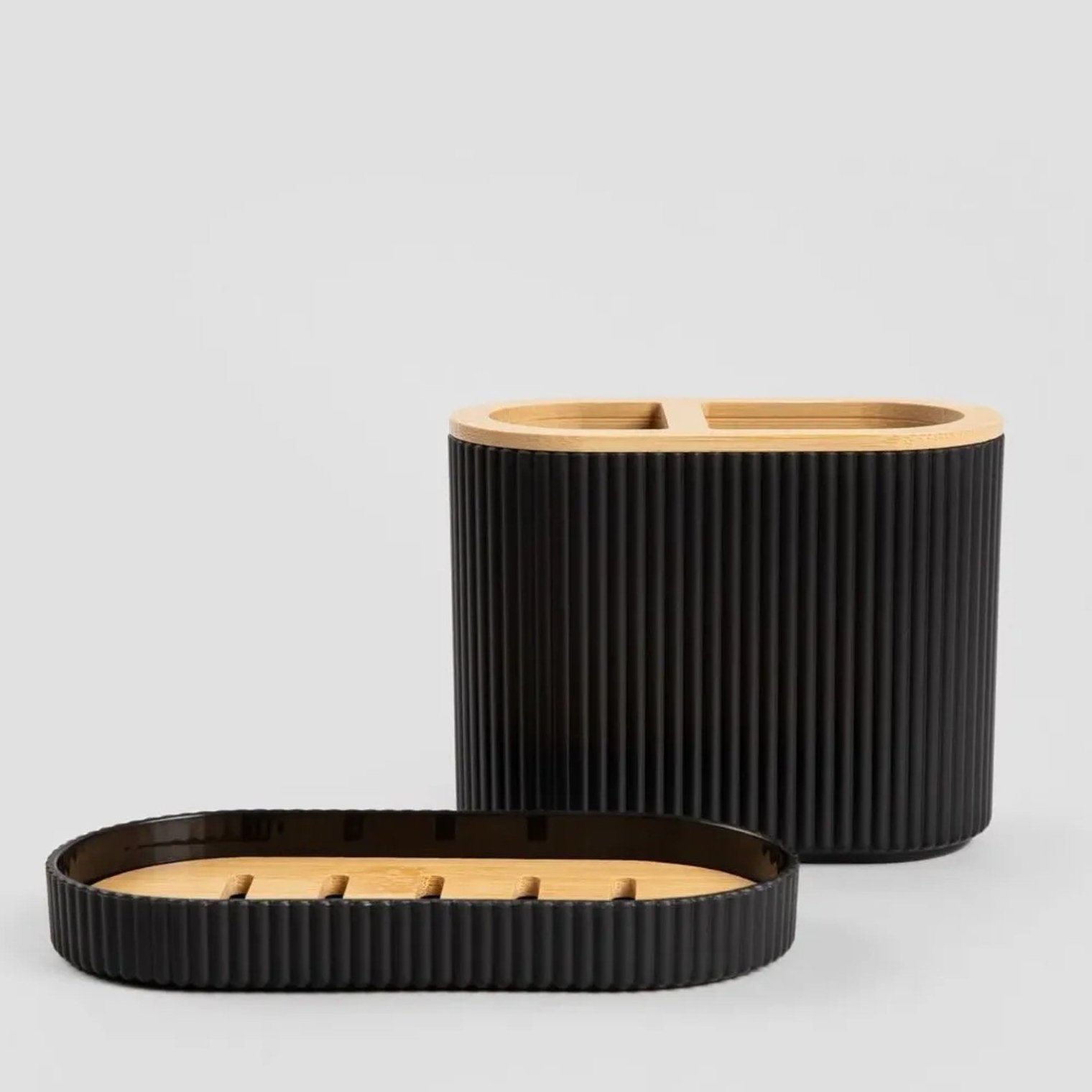 У набір входять дозатор рідкого мила, склянка, мильниця з дренажними канавками, тримач для зубних щіток та йоржик для унітазу з бамбуковою ручкою. Кожен елемент розроблений таким чином, щоб бути не лише функціональним, а й декоративним. Це ідеальний вибір для ванних кімнат у сучасному, лофтовому або мінімалістському стилі.