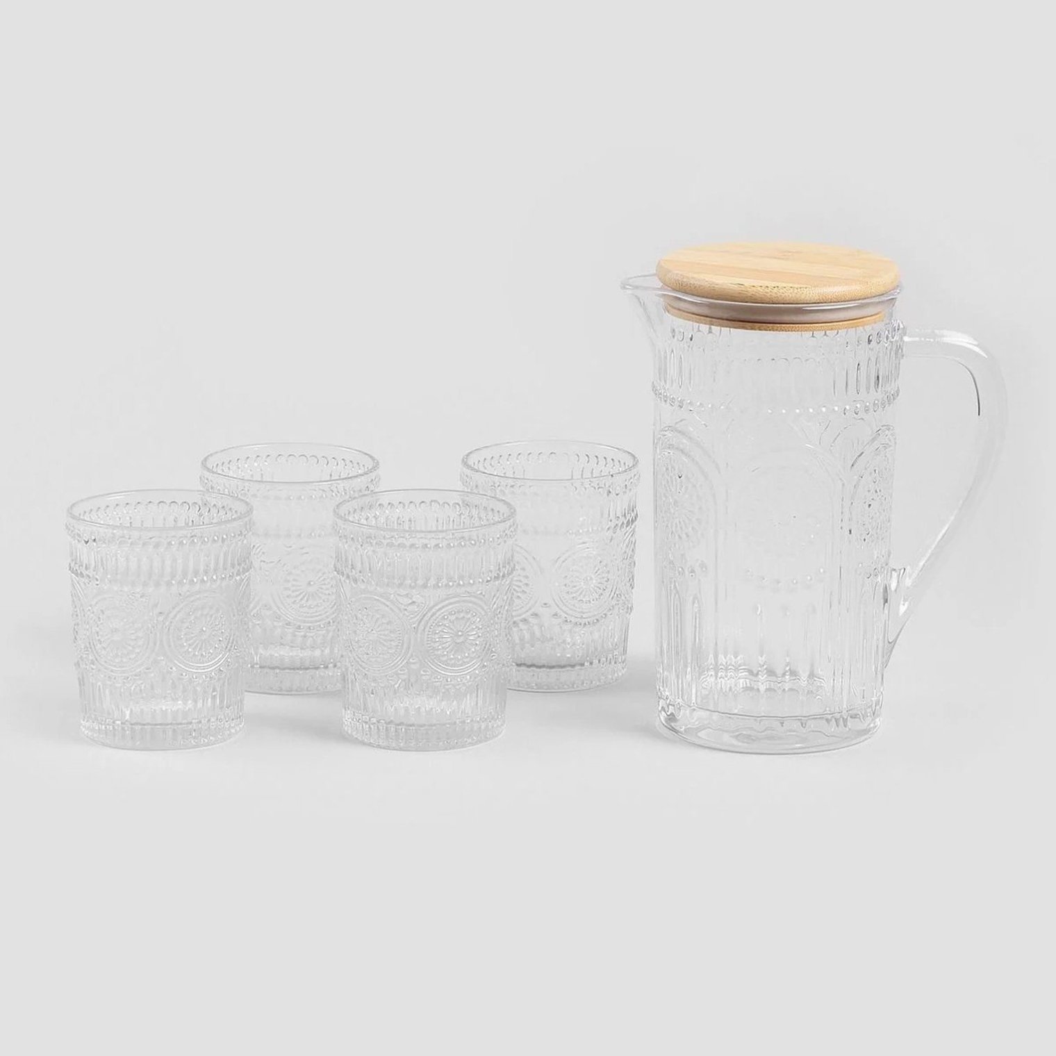 Прикрасьте свої застілля набором LOBOS – елегантним комплектом, що складається з глека та чотирьох склянок. Тонка рельєфна обробка скла надає йому неповторного характеру, а кришка натурального відтінку – стильний завершальний штрих. Ідеально підходить як для повсякденного використання, так і для особливих випадків.