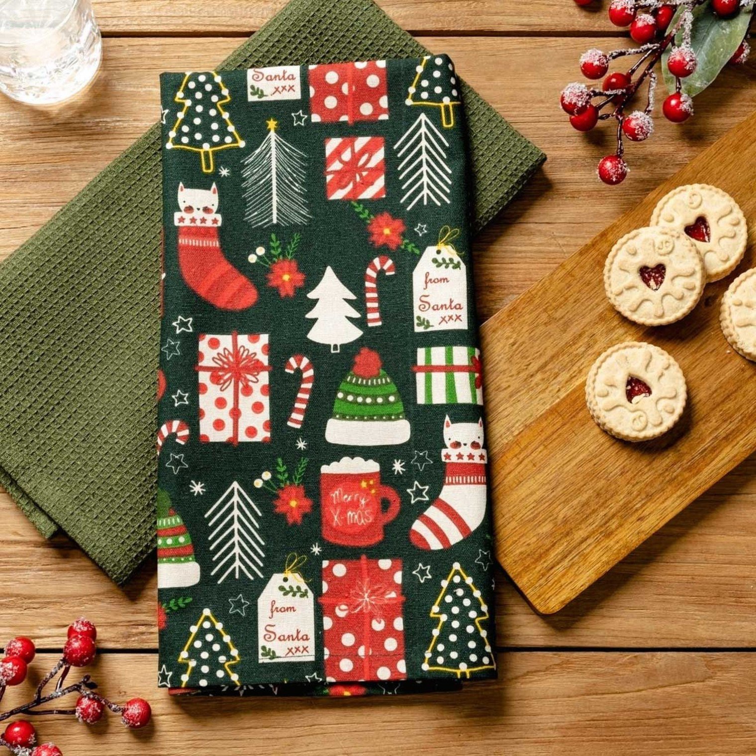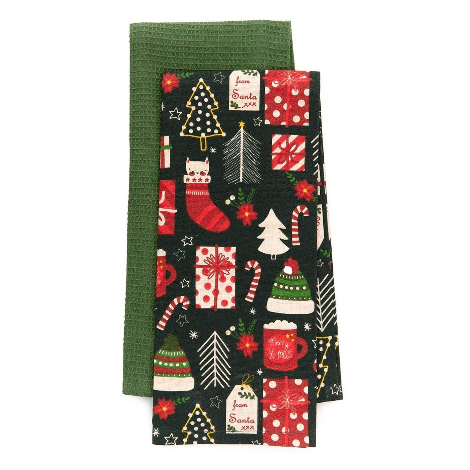 Набір кухонних рушників HOMLA SENTE включає один яскравий рушник з різдвяною тематикою і один більш універсальний однотонний, який можна використовувати цілий рік.
