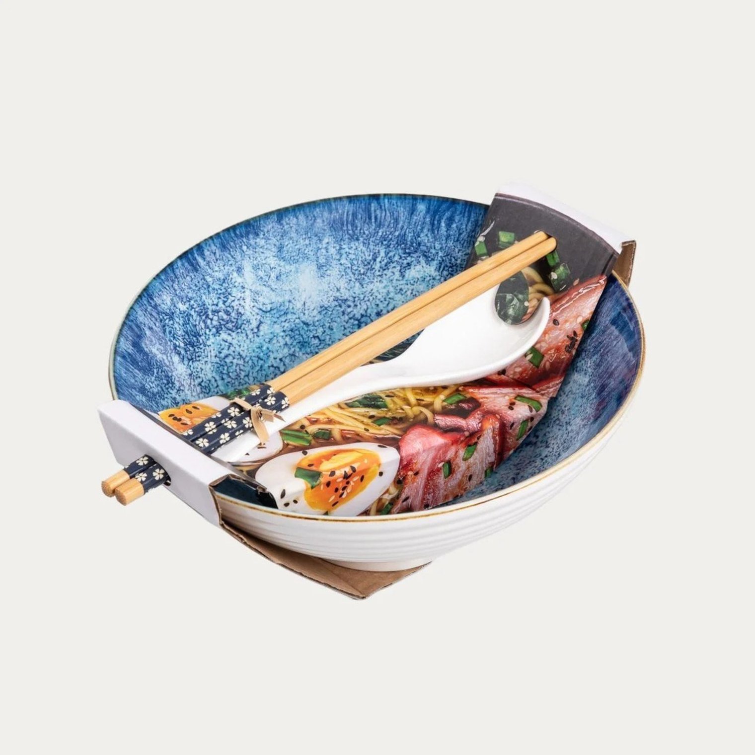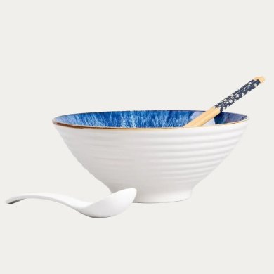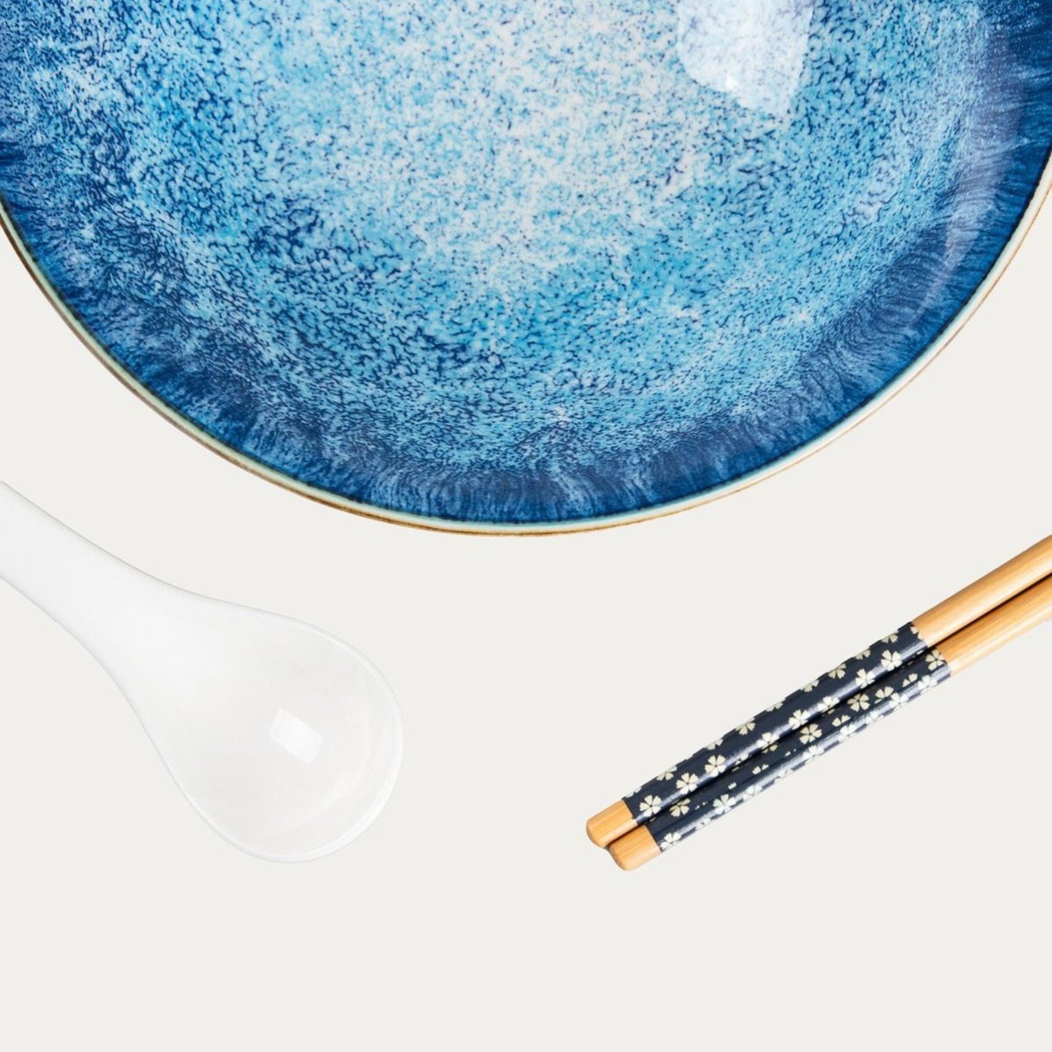 Набір для приготування рамена SALADO синього кольору з коричневою облямівкою діаметром 21 см включає фарфорову миску, ложку і бамбукові палички для їжі. Фарфорові елементи придатні для використання в мікрохвильовій печі.