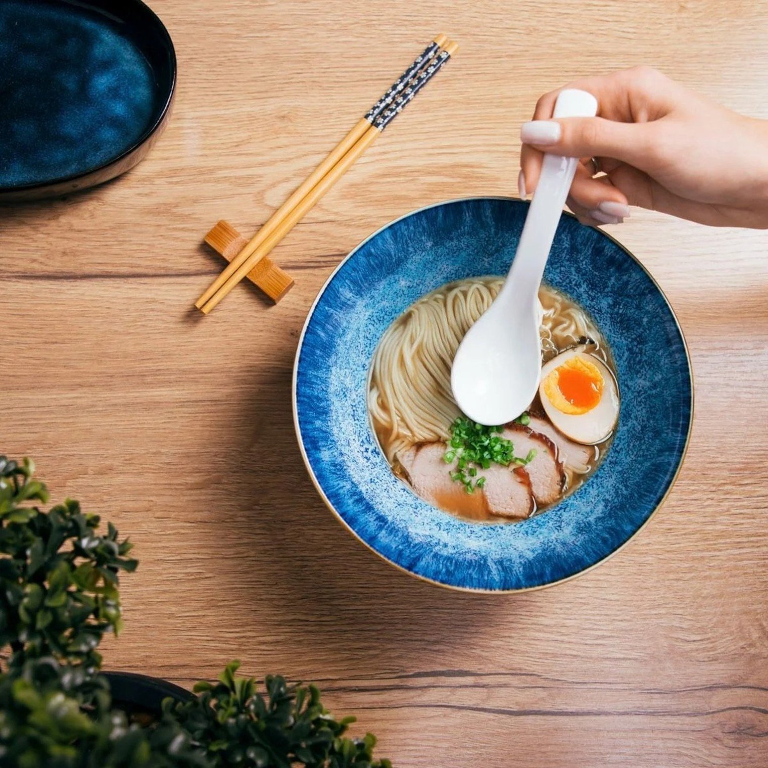 Правильно підібрані столові прилади для рамена дозволять подавати страву так, як це роблять в азіатських ресторанах. Набір для рамена SALADO зачаровує яскравим контрастом білого та насиченого синього кольору. Ложка та палички для їжі, що входять у комплект із мискою, дозволяють елегантно подавати та зручно їсти рамен.