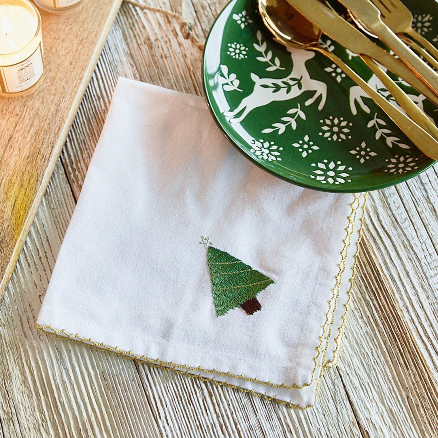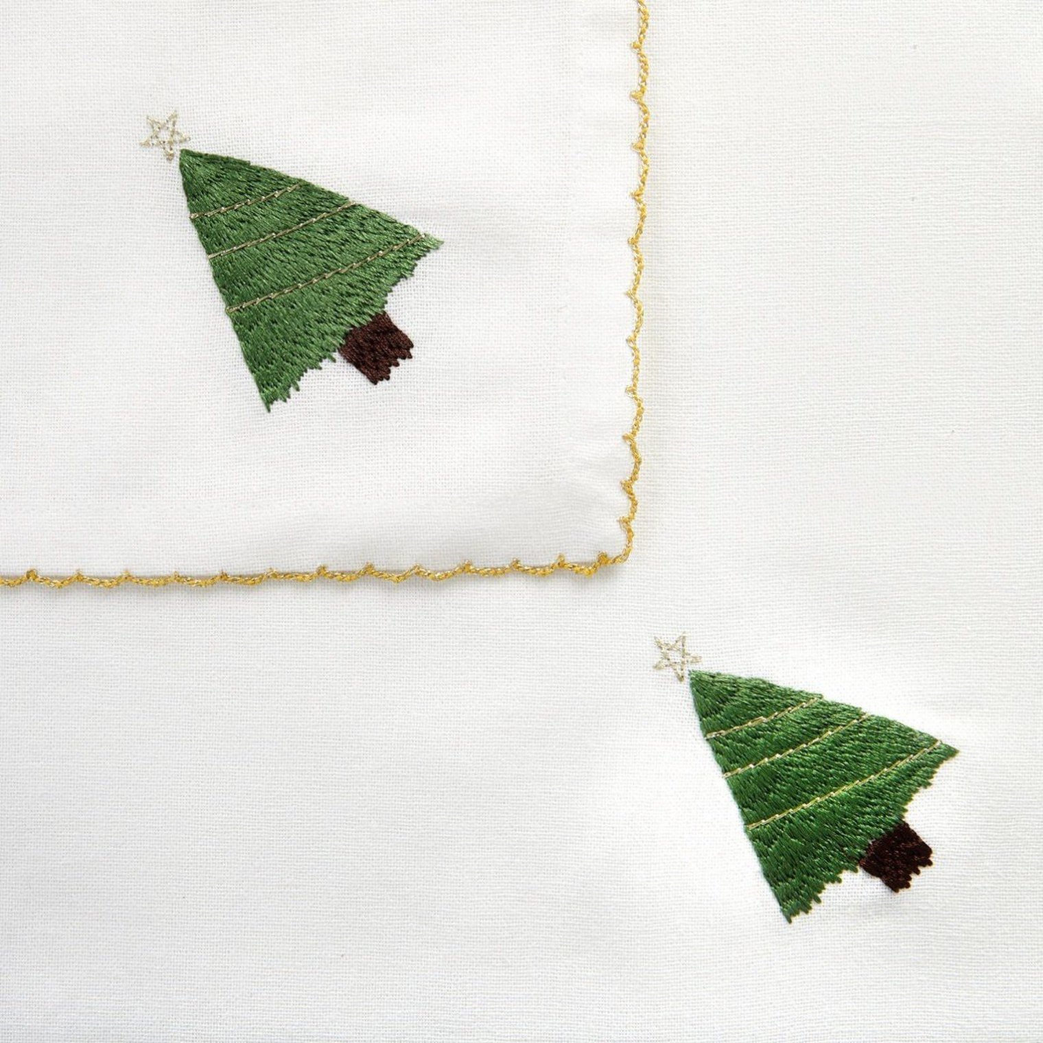 Різдвяні серветки HOMLA PAIA вражають своєю неповторною естетикою та майстерною роботою. У набір входять 2 білі серветки, кожен куточок яких прикрашений вишитим візерунком у вигляді ялинки. Красиво оброблені краї, оздоблені золотою ниткою, доповнюють образ. Завдяки мінімалістичному дизайну серветки виглядають дуже елегантно та ідеально впишуться у будь-яке сервірування столу.