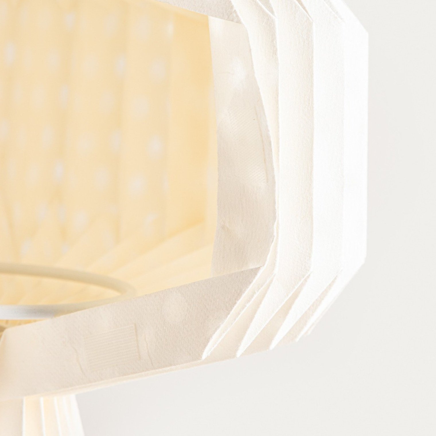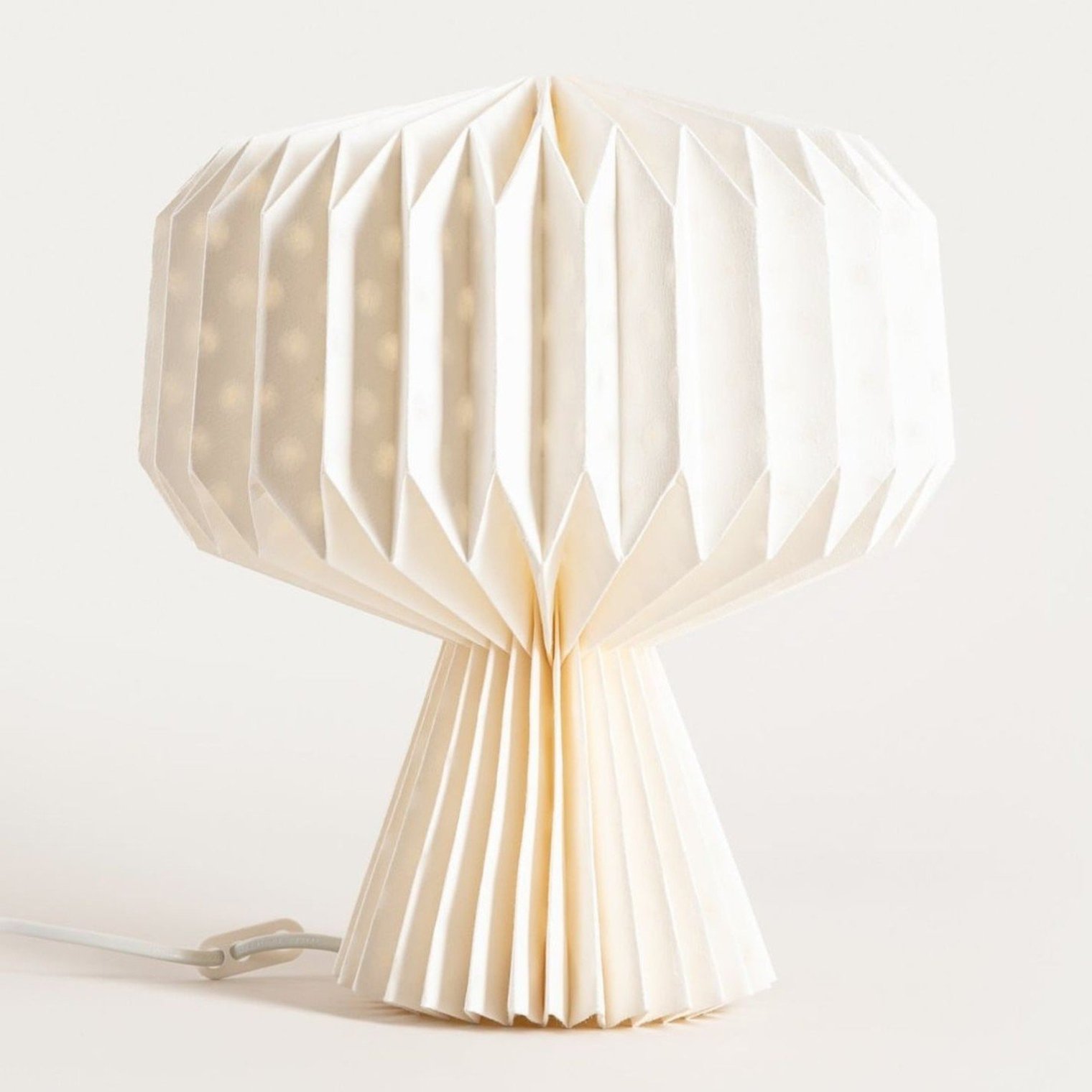 Абажур виготовлений з паперу та повністю оточує основу з патроном для лампочки E14. Дротове кільце навколо патрона підтримує форму абажура та забезпечує безпечне використання. Лампа GALLA Origami живиться від звичайної розетки (вона має вимикач); лампочка до комплекту не входить. Доступ до лампочки зручний після відстібання липучок, що фіксують абажур.