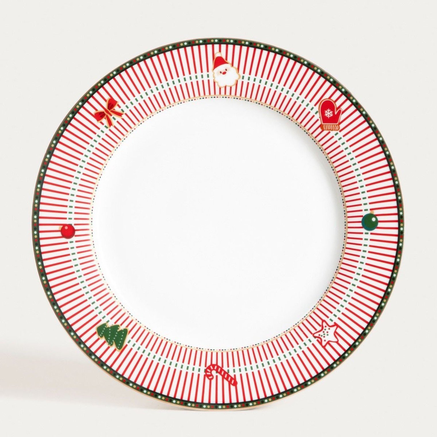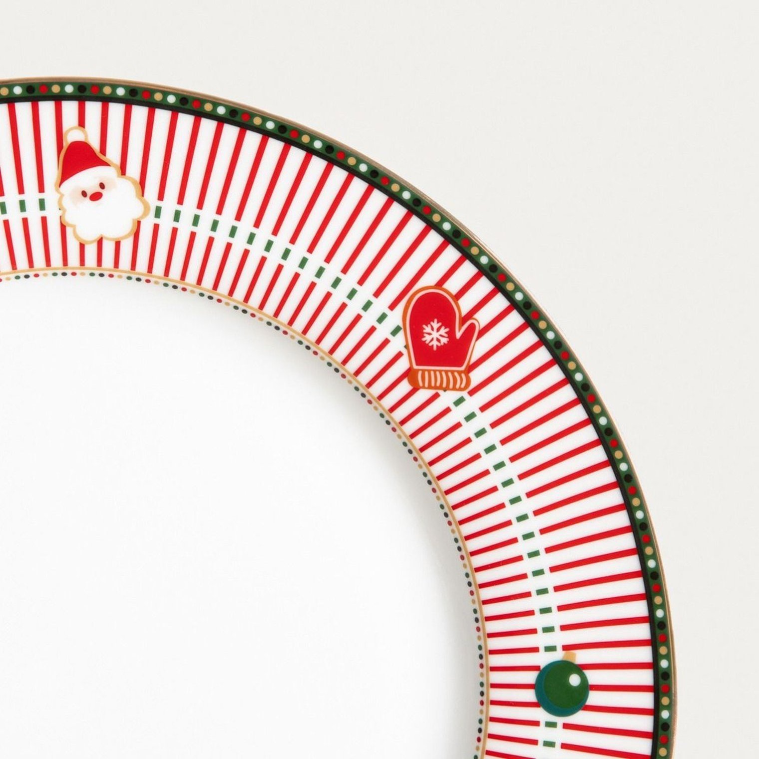 Ця порцелянова тарілка прикрашена чарівним смугастим візерунком та популярними святковими мотивами – ви знайдете різдвяну ялинку, Санта-Клауса, льодяники та ялинкові кулі. Це не тільки практична страва для сервірування, але й гарне доповнення до посуду.