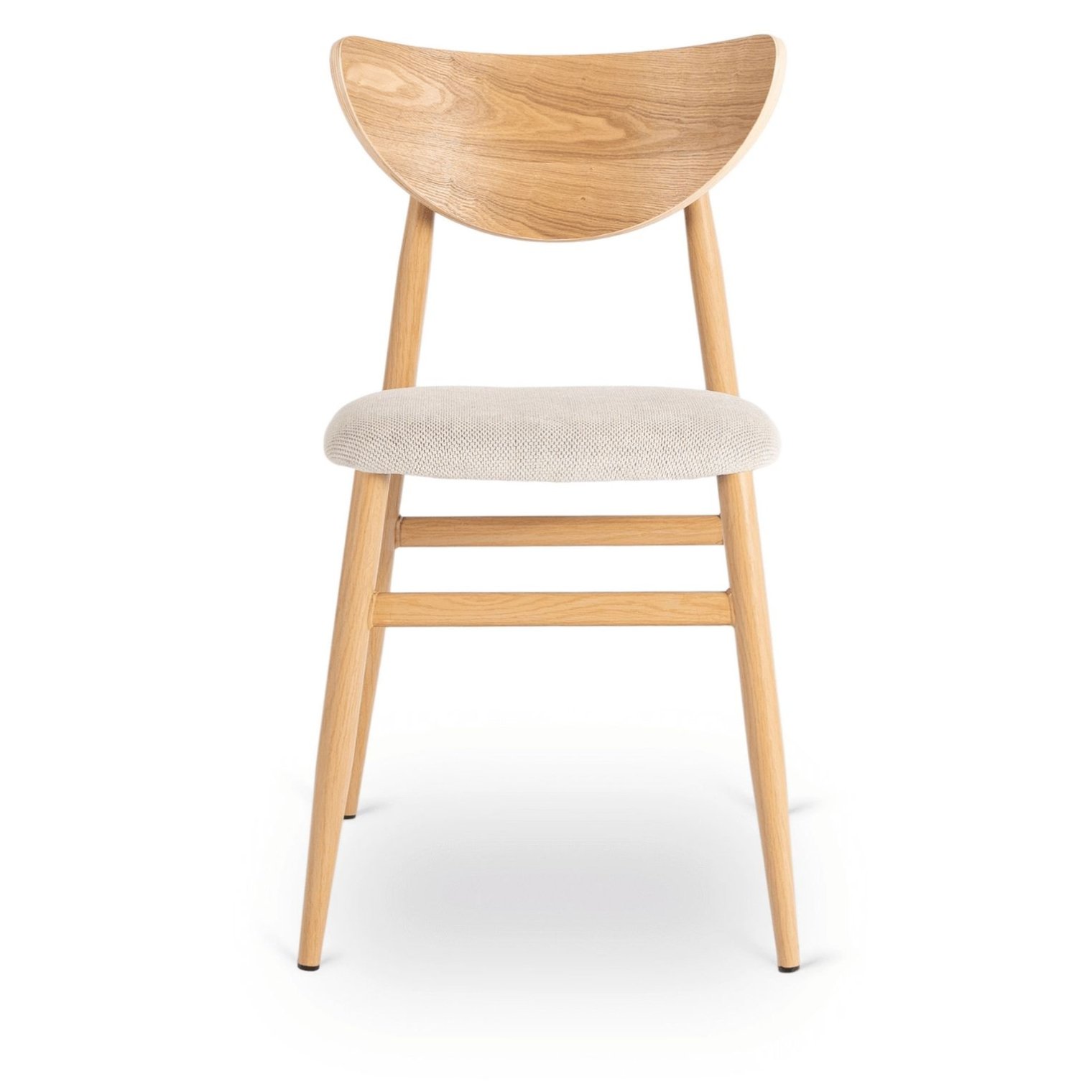 Braga - стильний стілець, натхненний дизайном минулих десятиліть, що ідеально підходить для сучасних інтер'єрів. Вигнута спинка кольору дуба і м'яке кремове сидіння створюють відчуття легкості і забезпечують повсякденний комфорт.