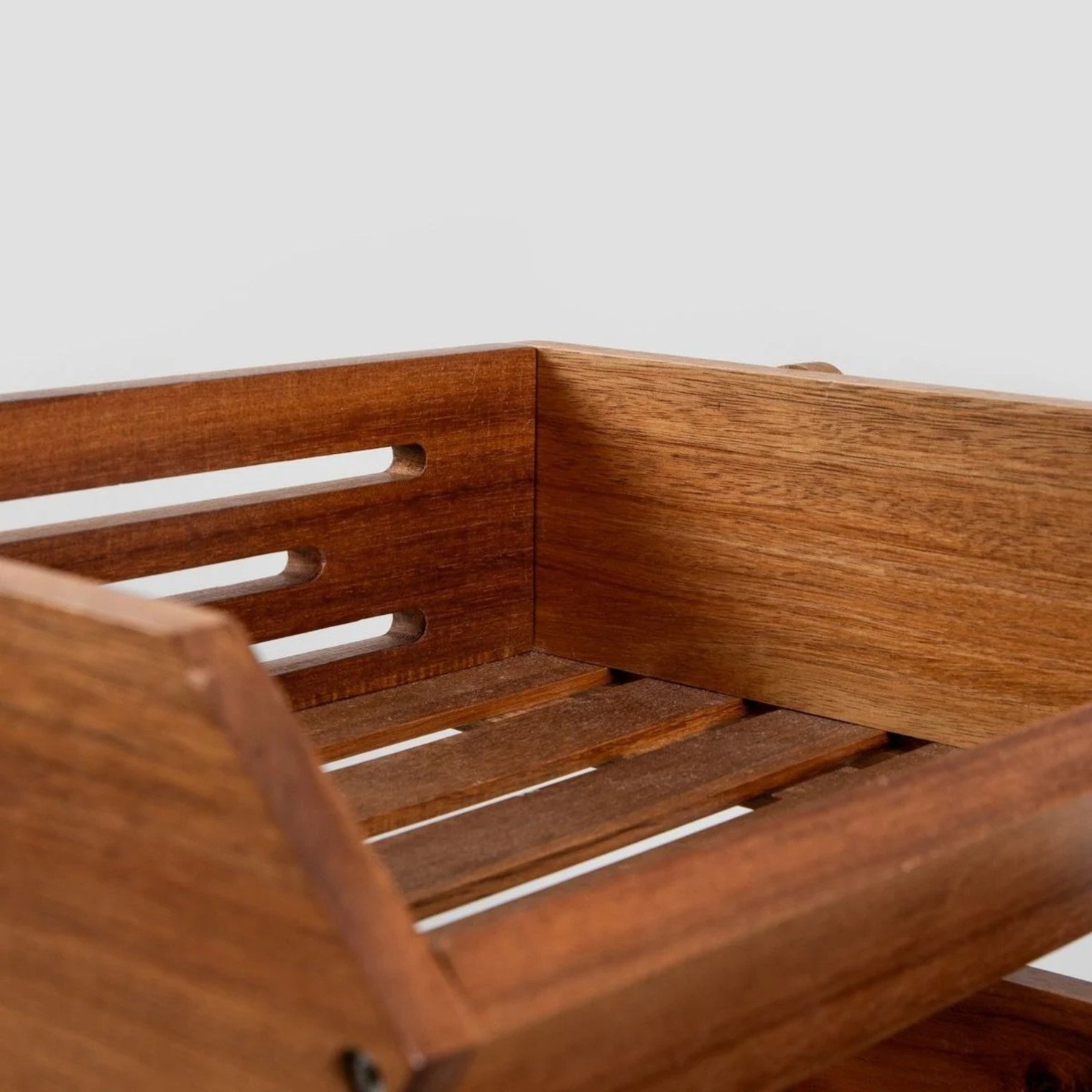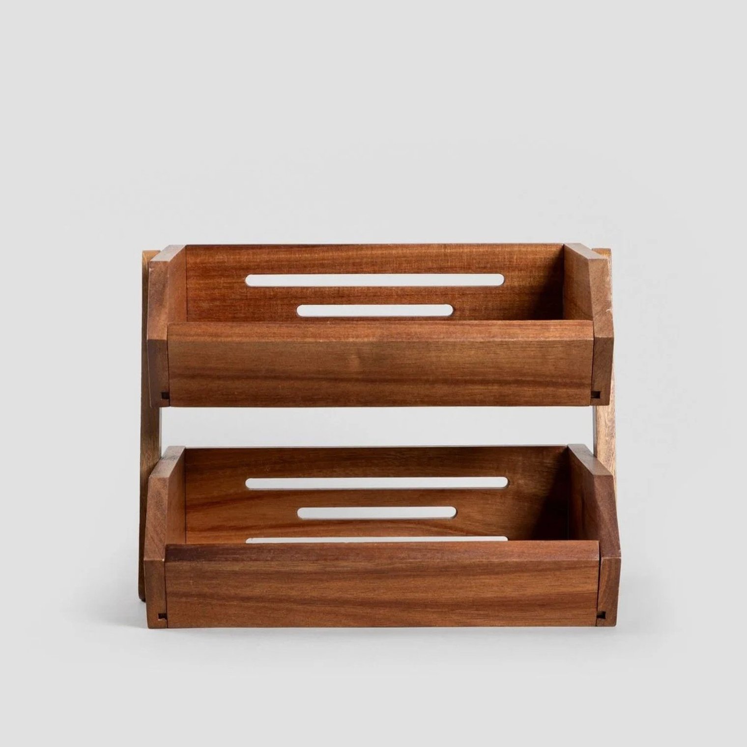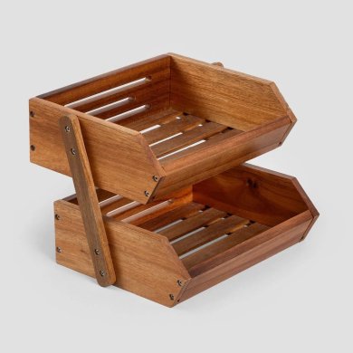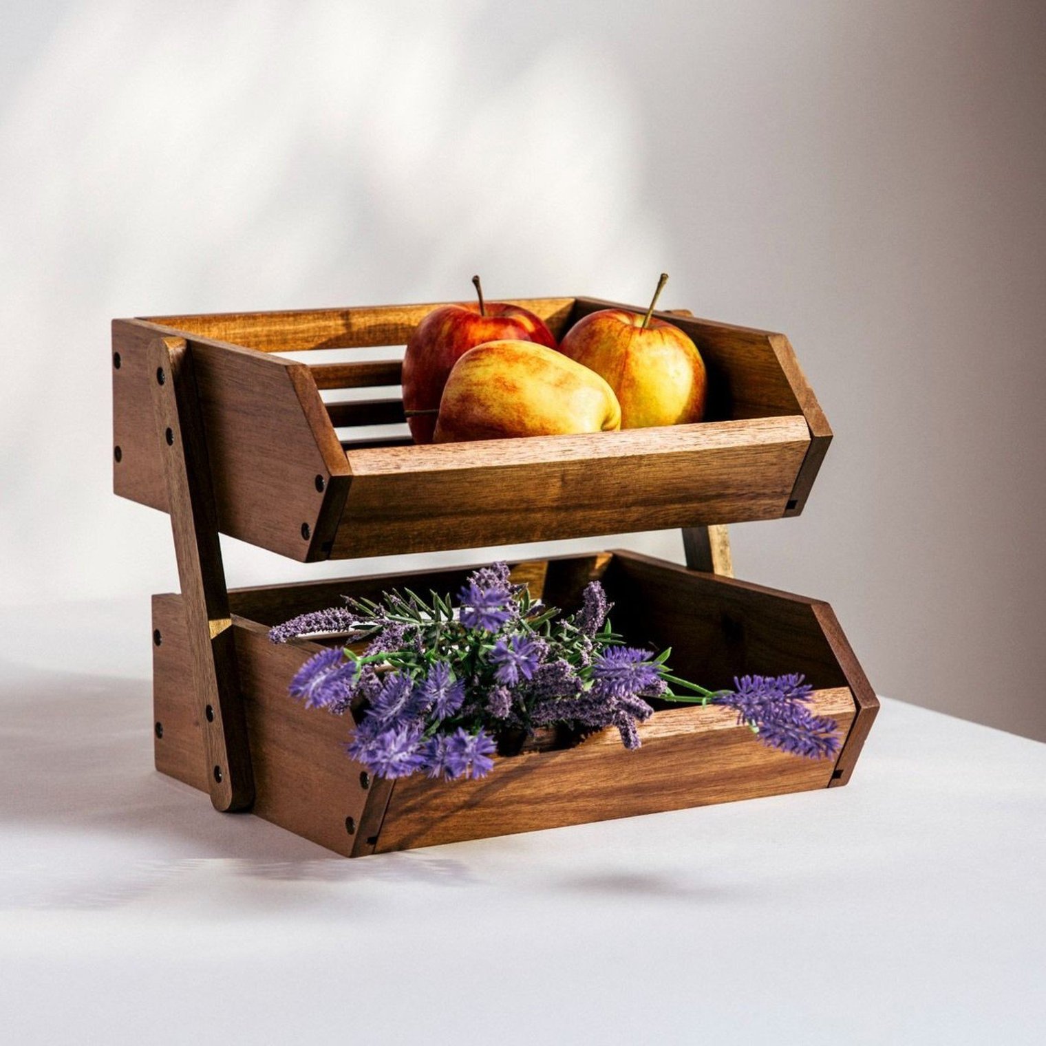 Виготовлений із високоякісної деревини, цей органайзер міцний, надійний та стійкий до повсякденного використання. Його відкрита конструкція забезпечує достатню циркуляцію повітря, допомагаючи довше зберігати свіжість продуктів, що зберігаються.