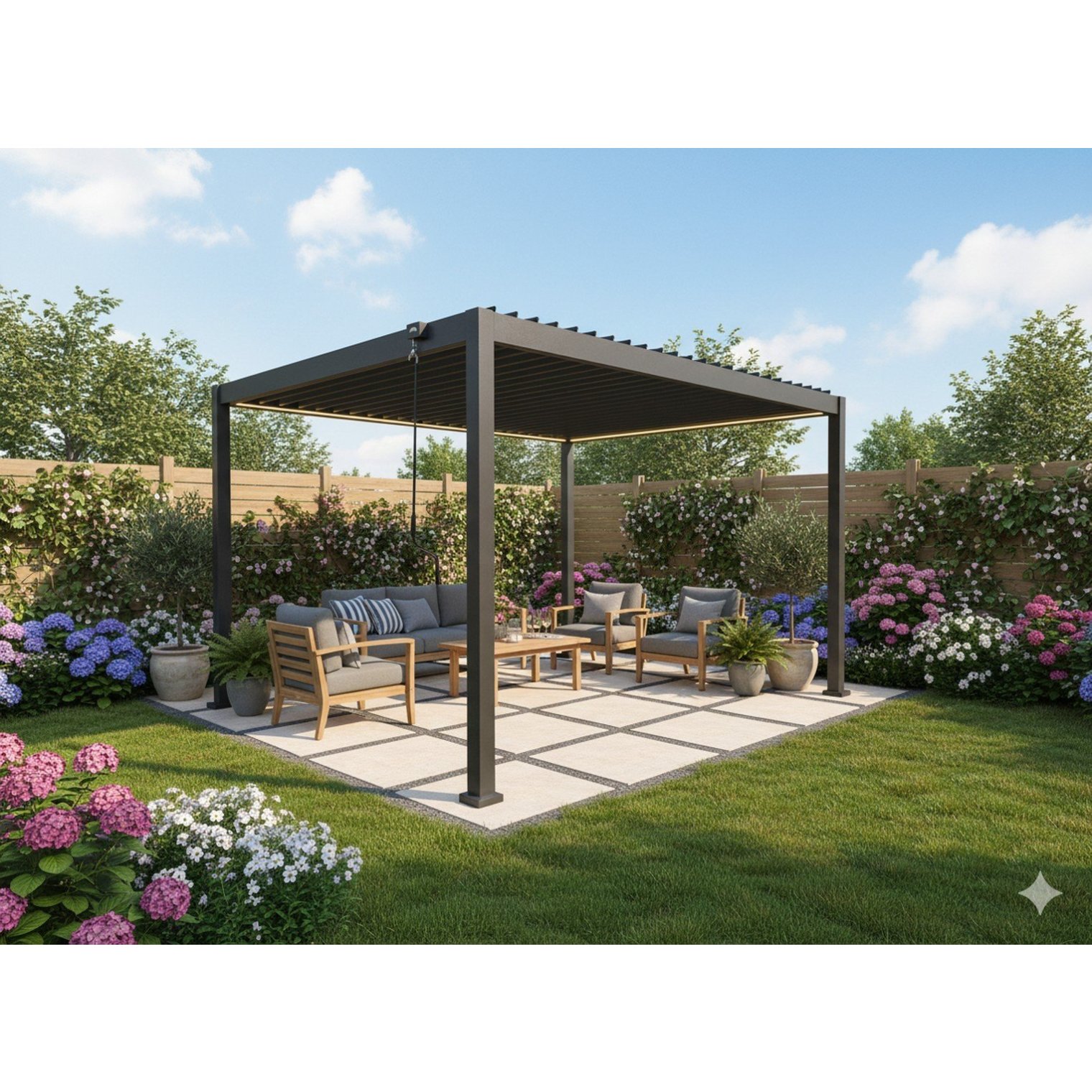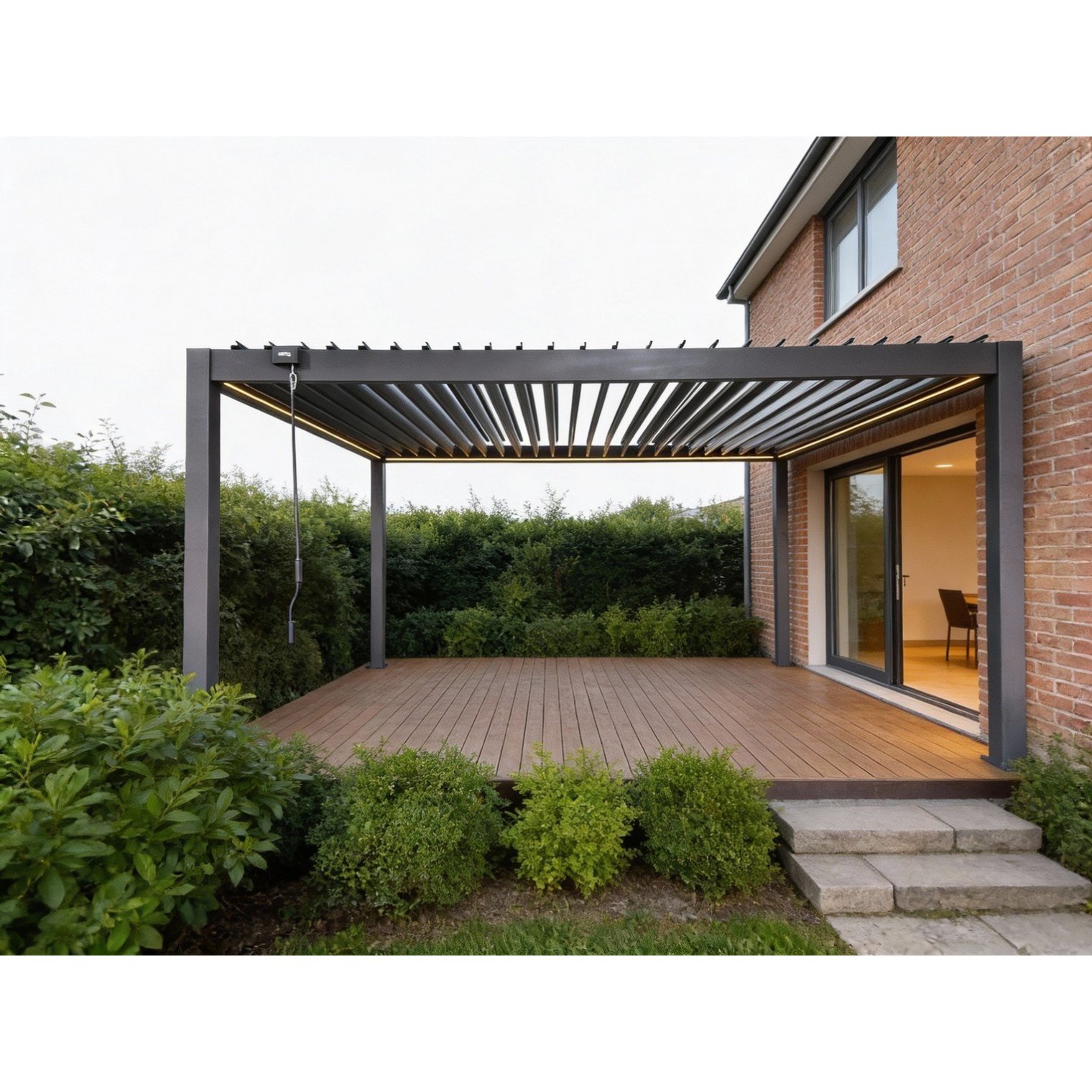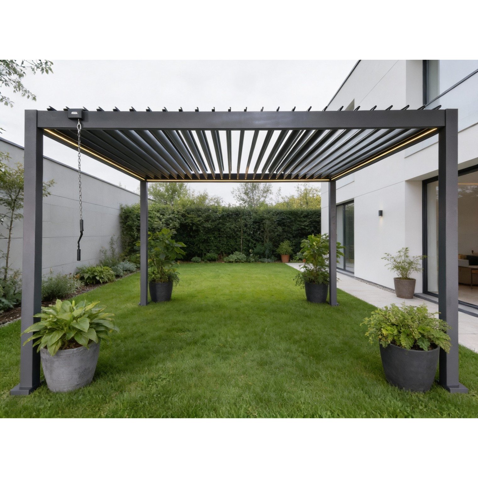 Пергола оснащена регульованим дахом з оцинкованих сталевих ламелей та інтегрованим LED-освітленням на сонячній панелі, що створює приємну атмосферу після настання темряви. Ручне керування дахом дозволяє точно регулювати кількість світла та вентиляцію, забезпечуючи ідеальні умови відпочинку незалежно від погоди.