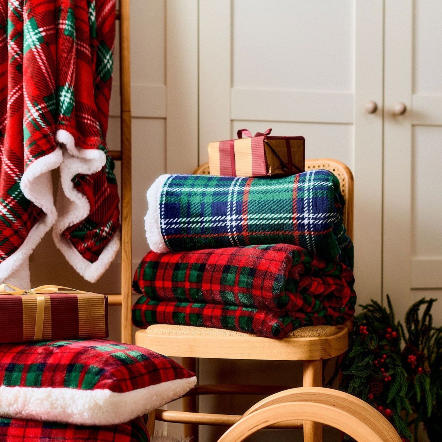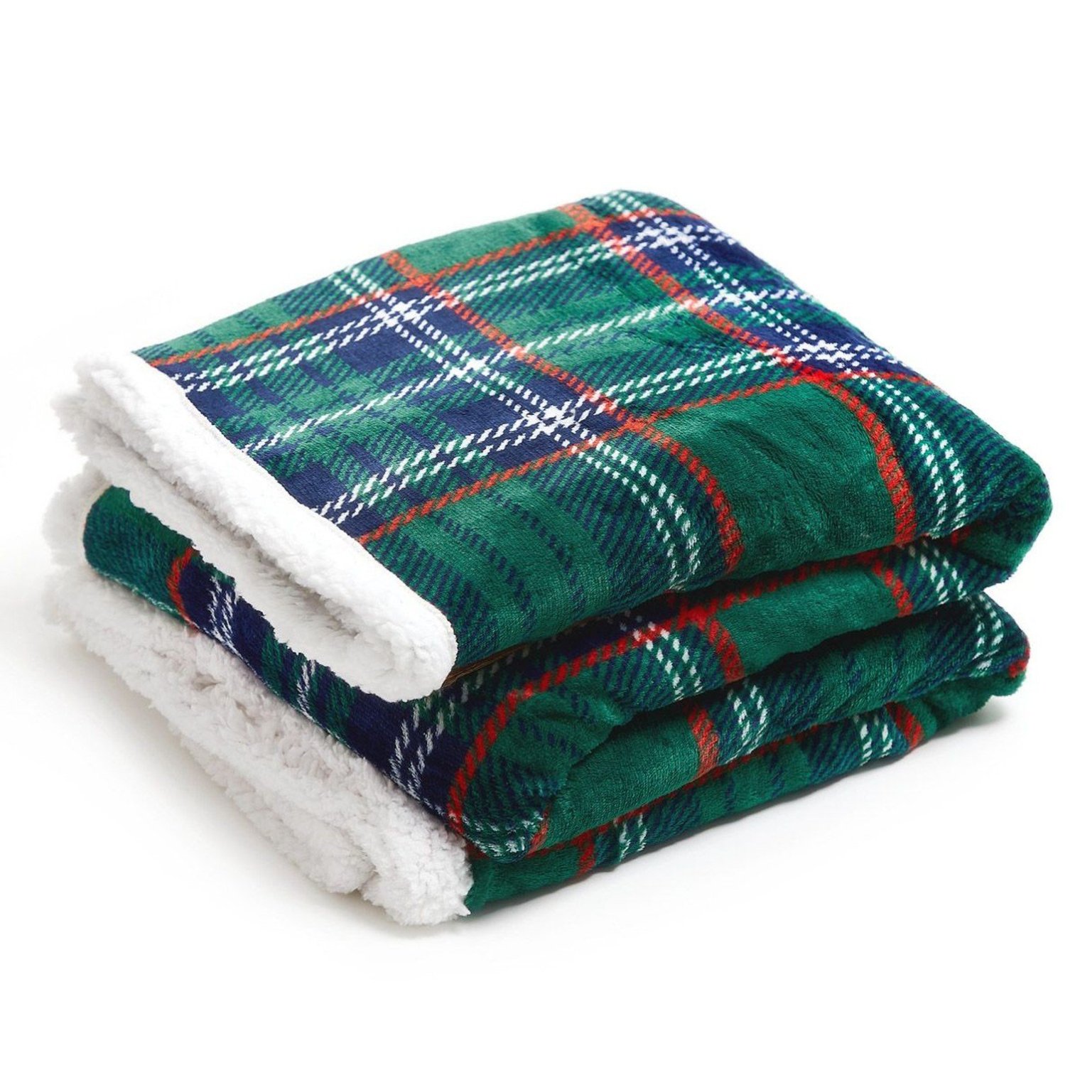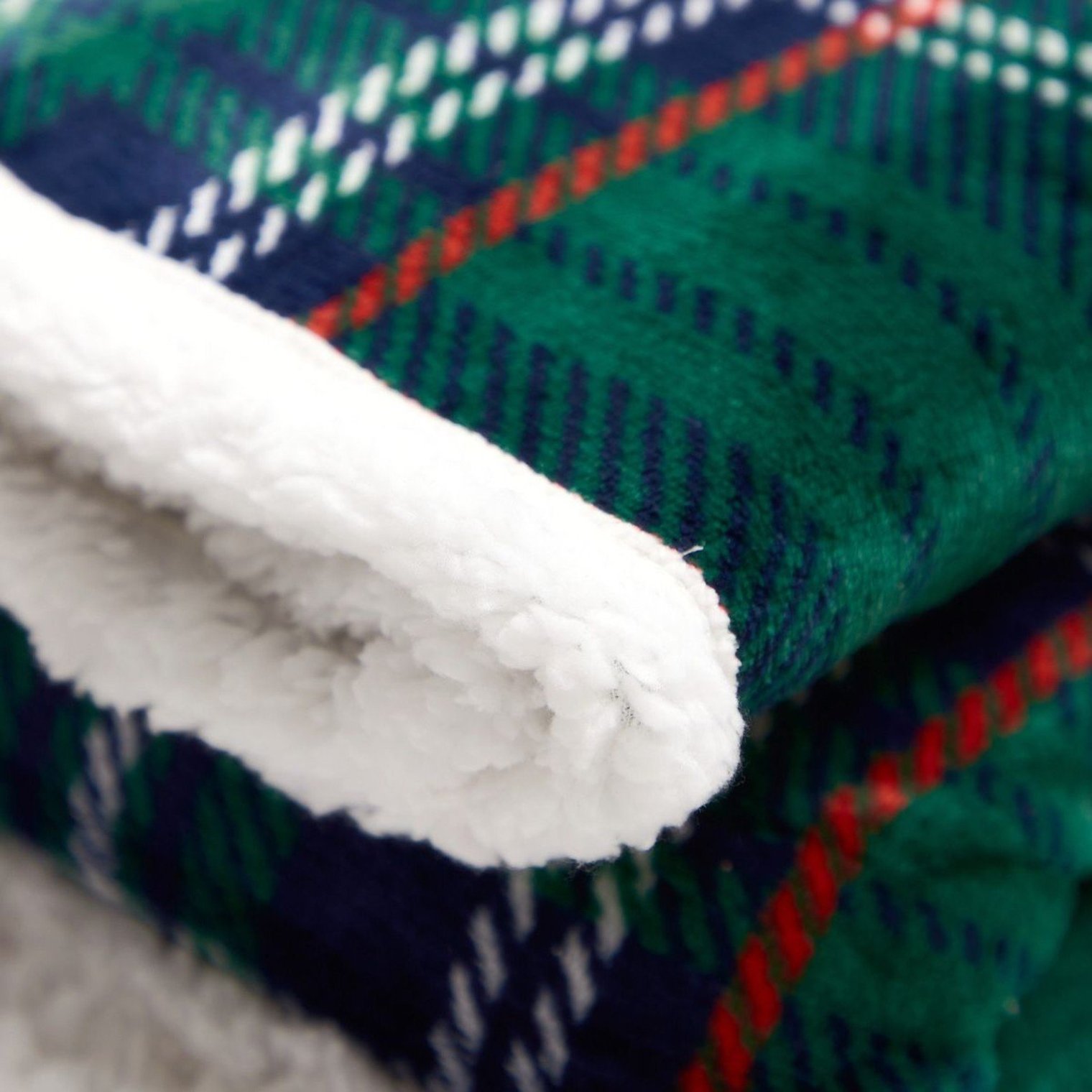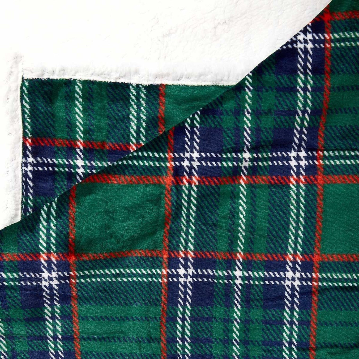 Двостороння ковдра з пухнастою зеленою шерпою в модну клітку.