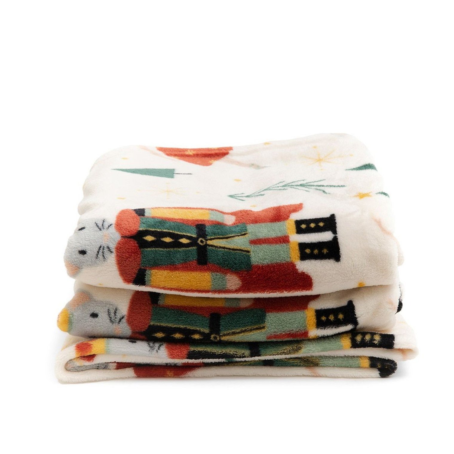 Плед "Лускунчик" бежевого кольору з різдвяним мотивом. Барвисті візерунки із зображенням Лускунчика, балерини та ялинок створюють затишну атмосферу. Плед легкий, але теплий. Влаштуйтеся зручніше у кріслі у вітальні, укутайтесь у теплий плед і насолоджуйтесь домашніми вечорами.