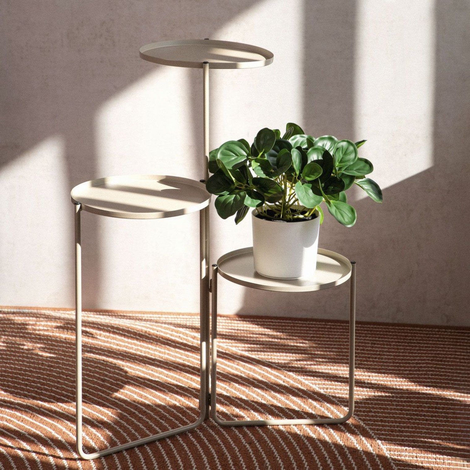 Підставка для рослин виготовлена з металу, що забезпечує довговічність та створює безпечне місце для ваших рослин. Бежеве покриття не лише додає естетичності, а й захищає від корозії, гарантуючи, що вона надовго збереже свій привабливий вигляд. Підтримувати її в чистоті легко: досить періодично протирати вологою тканиною.
