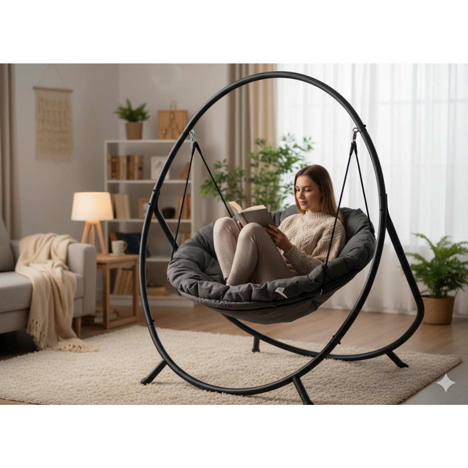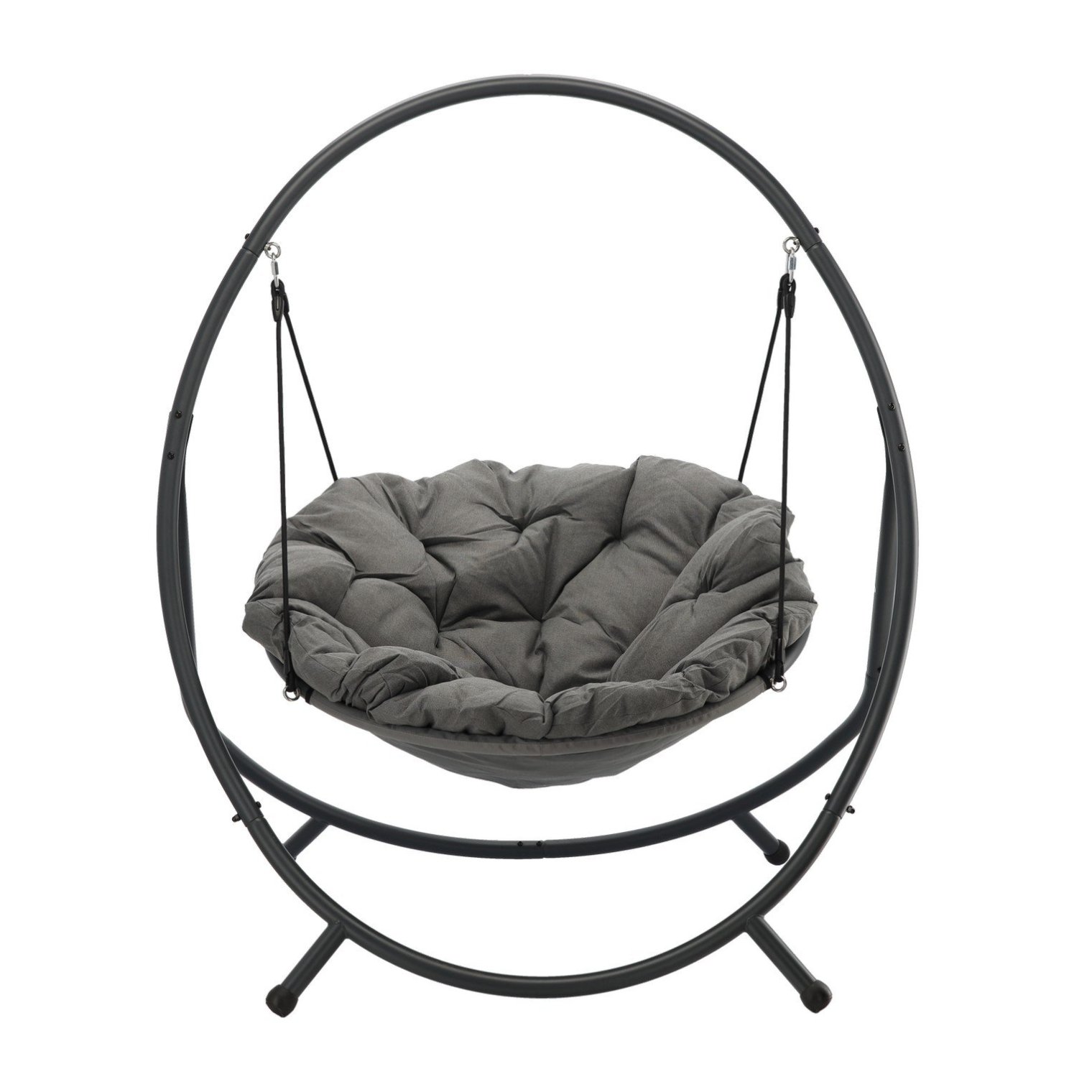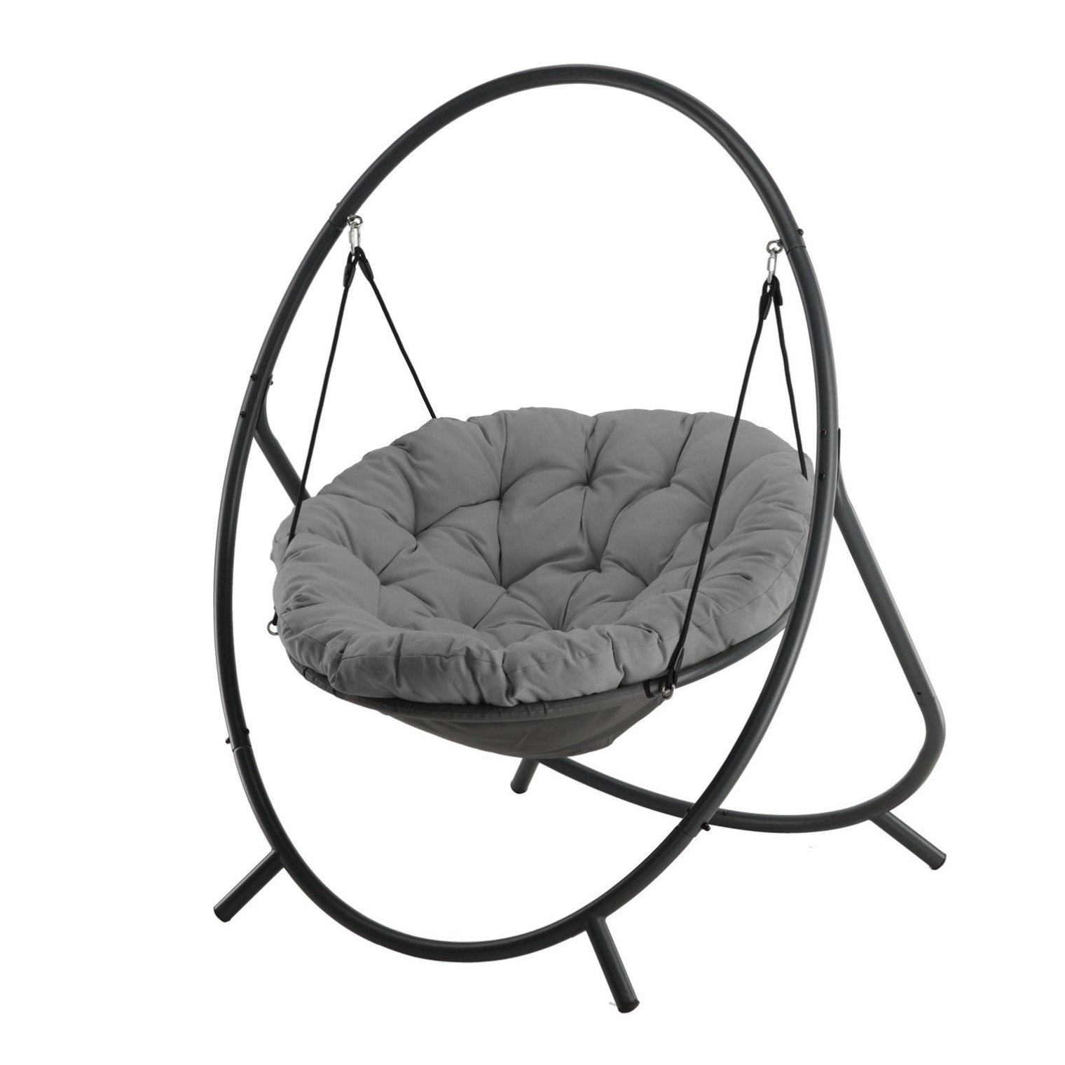Шукаєте сучасне сидіння, яке поєднує зручність із елегантністю? Підвісне крісло PATIO з темно-сірою подушкою та сірою рамою – стильний акцент для будь-якого саду, тераси чи балкона.