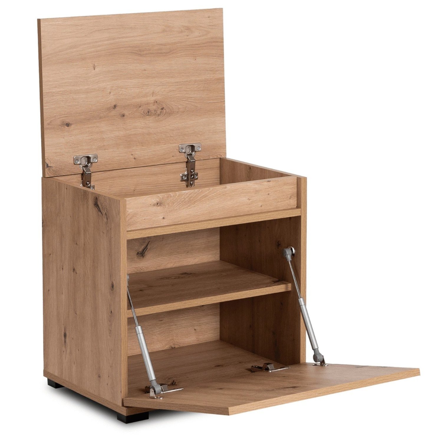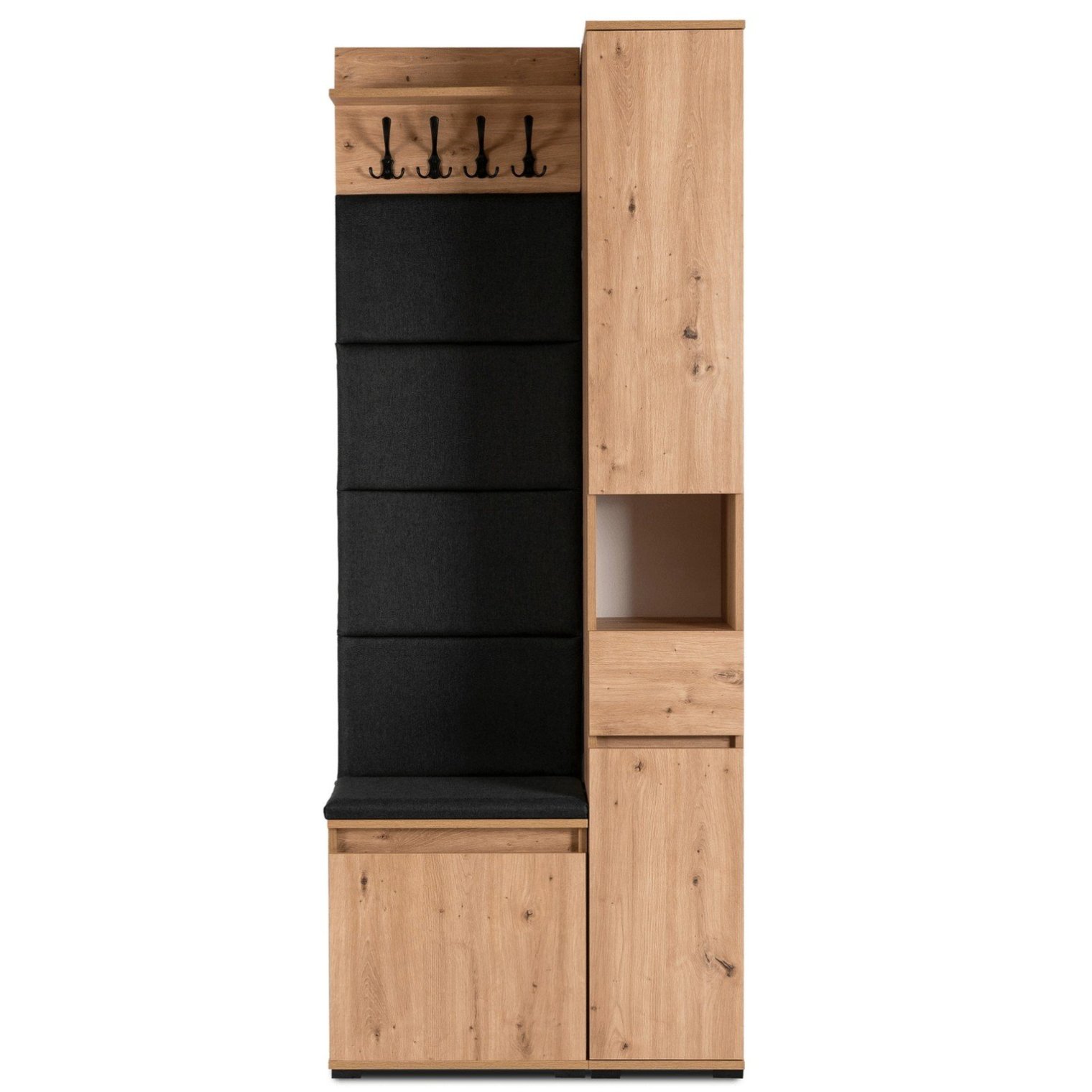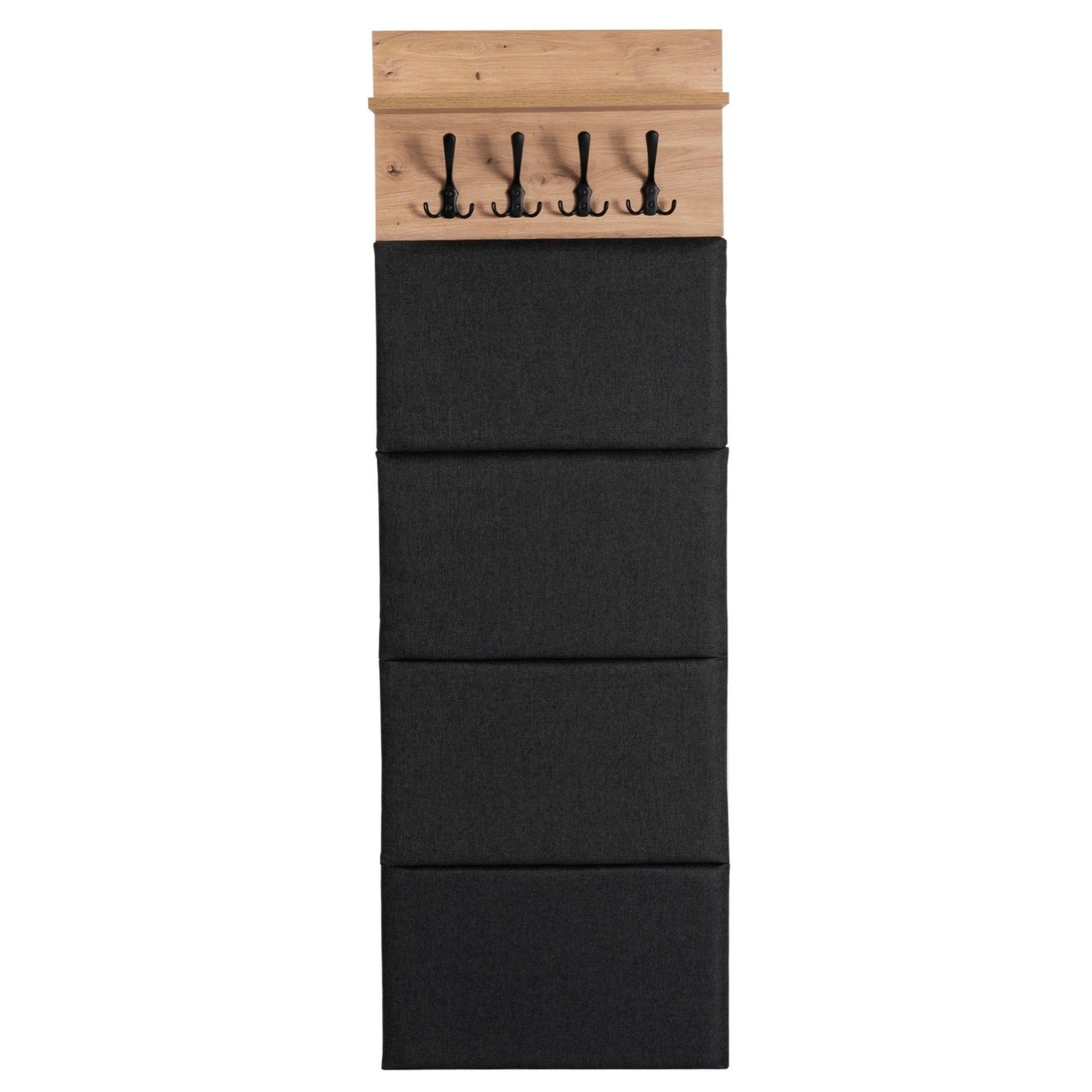 Prato - це сучасний дизайн у відтінках графіту та дуба ручної роботи, що ідеально підходить для передпокоїв. Комплект складається з трьох практичних предметів: шафи з м'яким сидінням, високої колони і настінної панелі з вішалками. Завдяки продуманому дизайну він відмінно впишеться як у просторі вітальні, так і невеликі квартири.