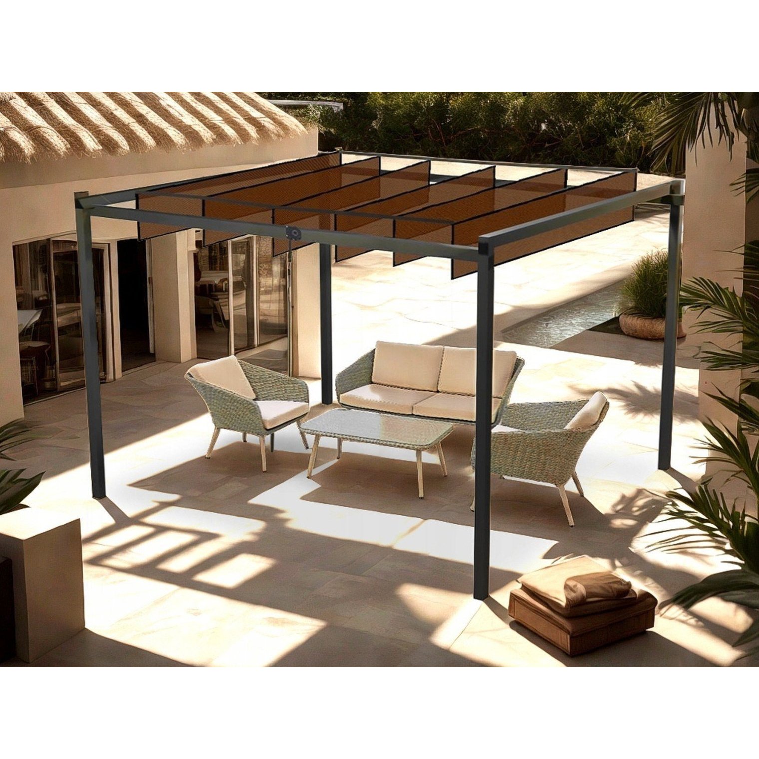 Елегантна та функціональна садова пергола з регульованими ламелями – ідеальне рішення для тих, хто хоче комфортно користуватися терасою чи садом незалежно від погоди. Сучасна конструкція поєднує естетику з практичністю - захищає від сонця, а у разі дощу ефективно приховує простір для відпочинку. Це чудове місце для релаксу, сімейних зустрічей та літніх вечорів у саду.