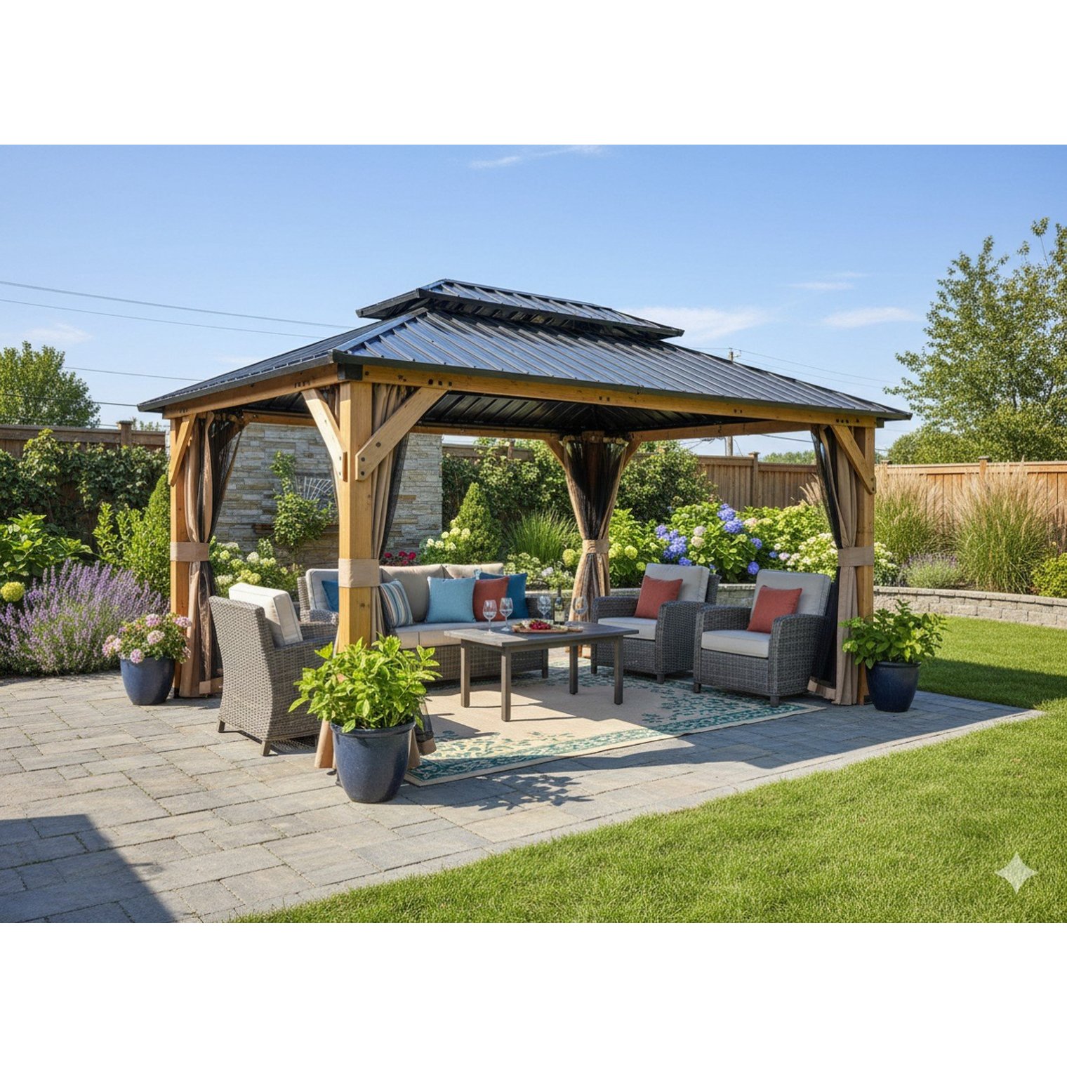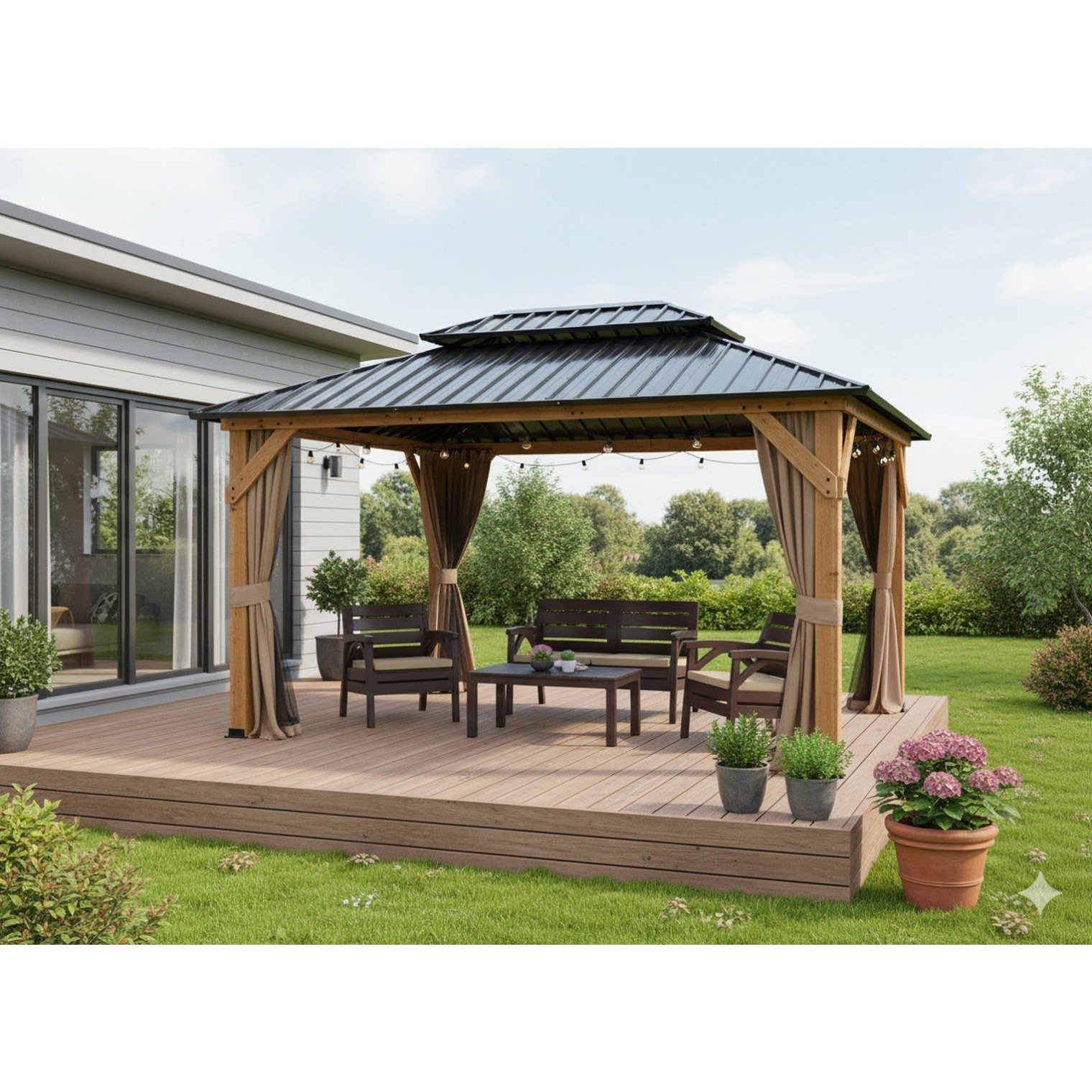 Створіть виняткове місце для відпочинку у своєму саду. Ця елегантна садова альтанка поєднує натуральну ялинову деревину із міцною сталевою конструкцією, створюючи довговічний, естетичний та функціональний простір для відпочинку. Ідеально підходить для сімейних зустрічей, літніх обідів чи спокійних вечорів за чашкою кави.