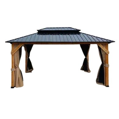 - Сталевий дах із листа товщиною 0,3 мм — міцне покрівельне покриття ефективно захищає від сонця, дощу та легкого граду, забезпечуючи комфорт у будь-яку погоду. Крім того, дах надає альтанці сучасного та естетичного вигляду.