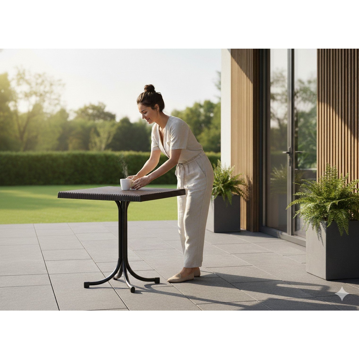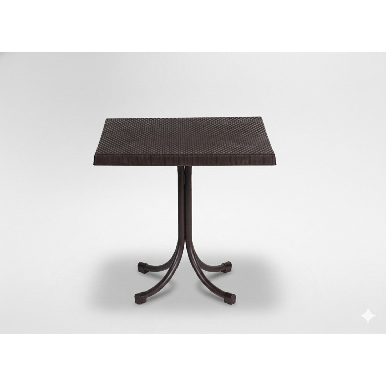 Стільниця виготовлена з високоякісного пластику, що точно відтворює структуру ротанга, при цьому володіючи стійкістю до погодних умов. Сталева конструкція ніжки гарантує стабільність та довговічність, завдяки чому столик підійде як для приватного, так і для комерційного використання.
