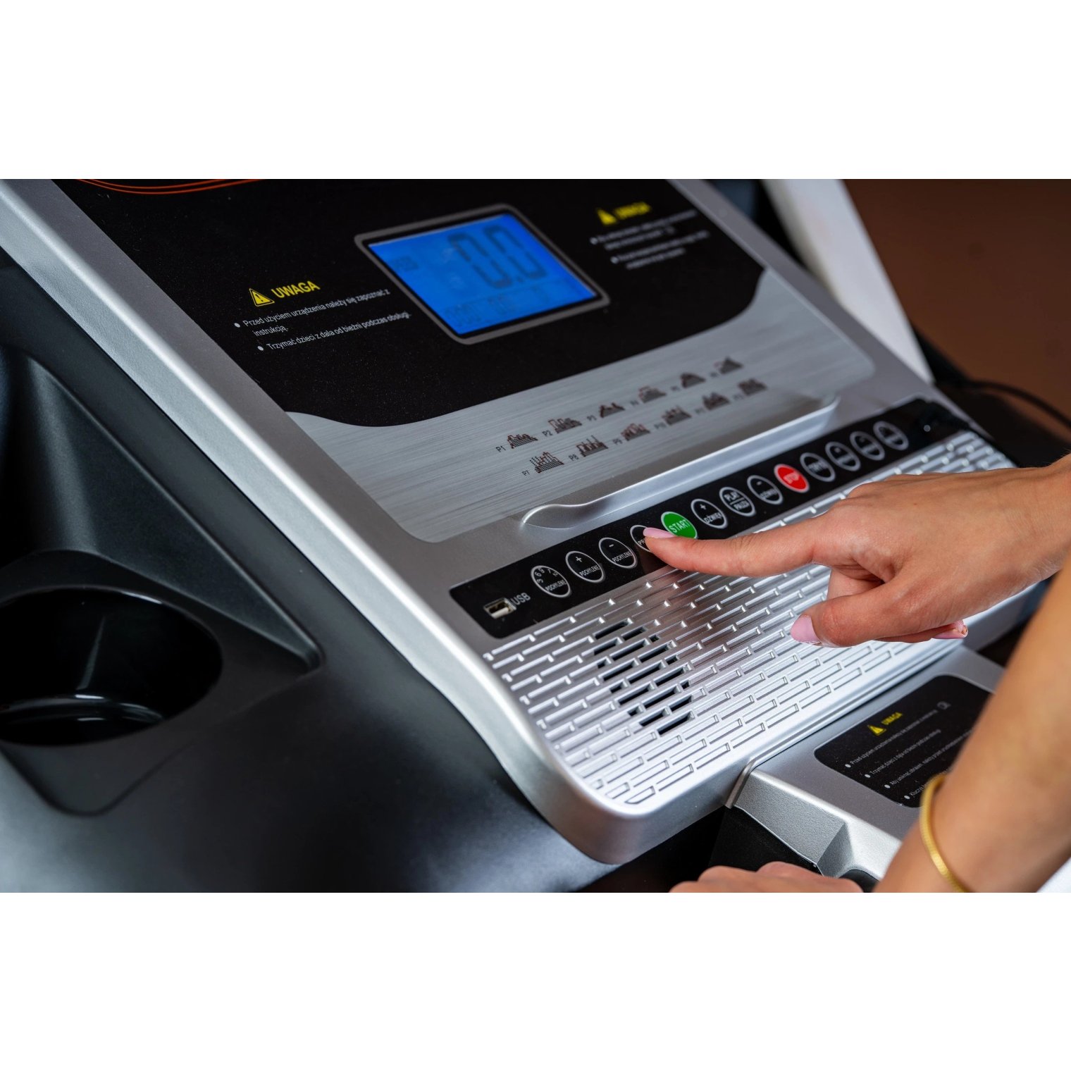 Бігова доріжка дуже ергономічна та зручна у зберіганні. Після тренування її легко скласти. Вона розвиває швидкість до 20 км/год. Цей сучасний пристрій оснащений РК-дисплеєм та вбудованим вимірювальним комп'ютером. 12 програм тренувань дозволяють індивідуально вибирати час тренування та рівень складності.
