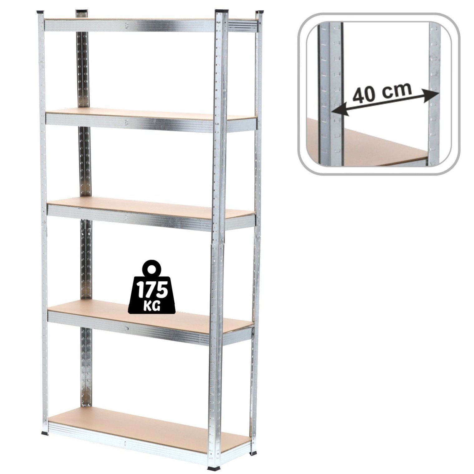 Цей п'ятиярусний стелаж - практичне та міцне рішення для зберігання різних предметів. Висота полиць, що регулюється, дозволяє легко адаптувати його до ваших потреб. Стійка конструкція з оцинкованих металевих профілів та полиць із МДФ забезпечує довговічність та міцність. Кронштейни під кожною полицею додатково посилюють конструкцію. Максимальна вантажопідйомність 175 кг робить стелаж дуже функціональним та міцним. Просте складання забезпечує швидку установку.