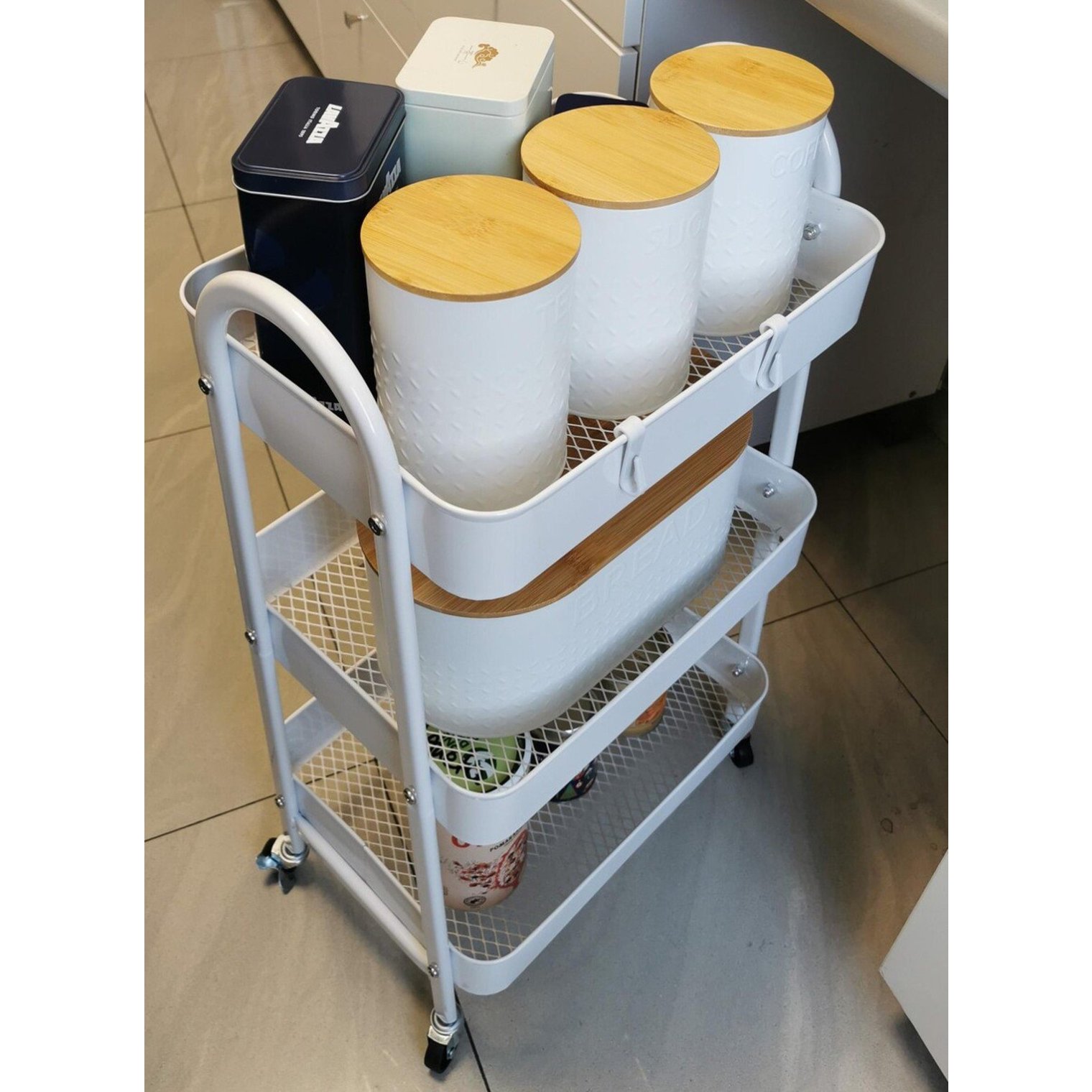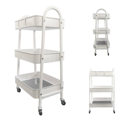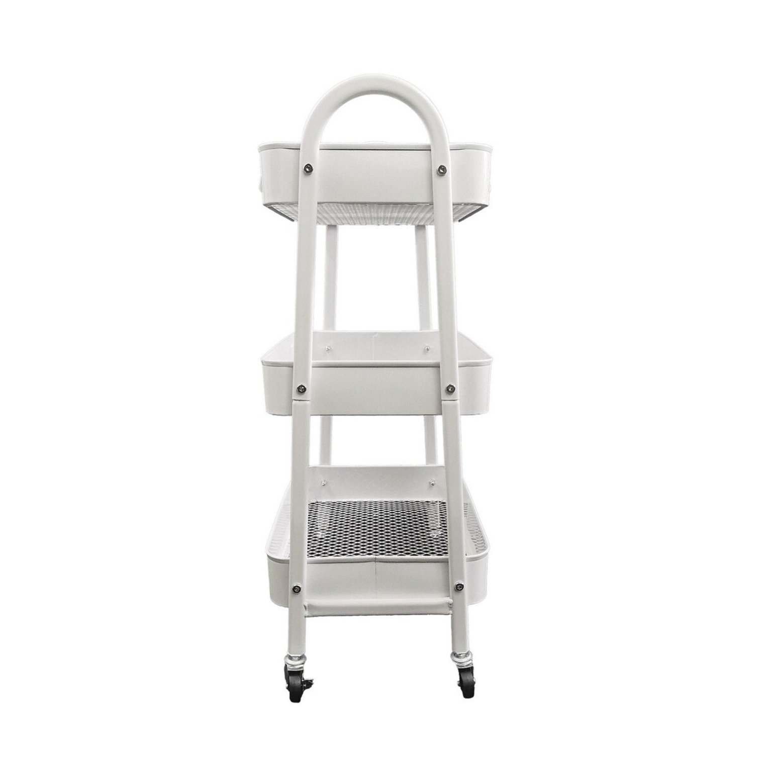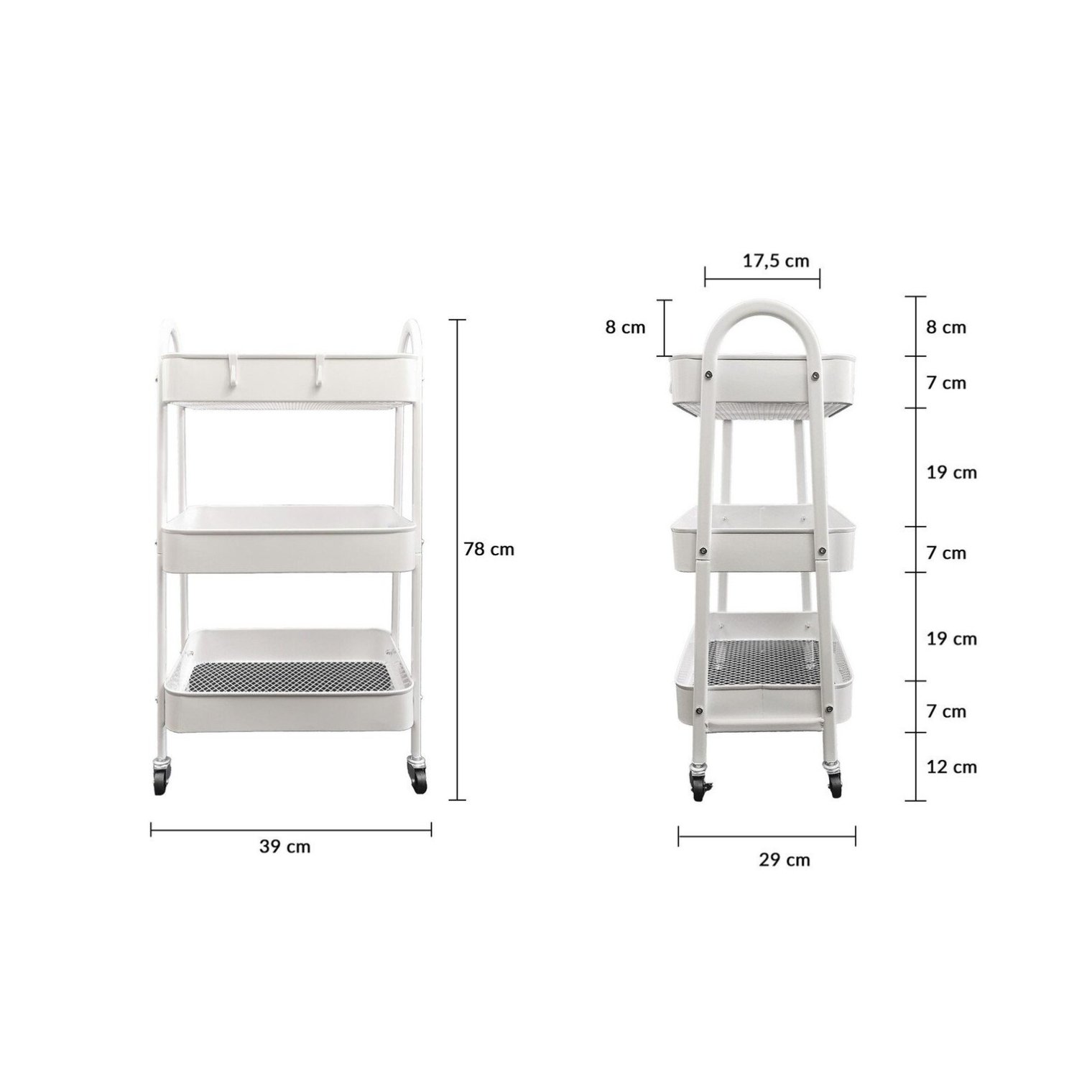 Цей триярусний білий металевий візок - елегантний і практичний предмет меблів, що ідеально доповнює як сучасні, так і класичні інтер'єри. Компактні розміри та мобільна конструкція роблять її ідеальним варіантом для кухні, ванної кімнати, вбиральні або офісу.