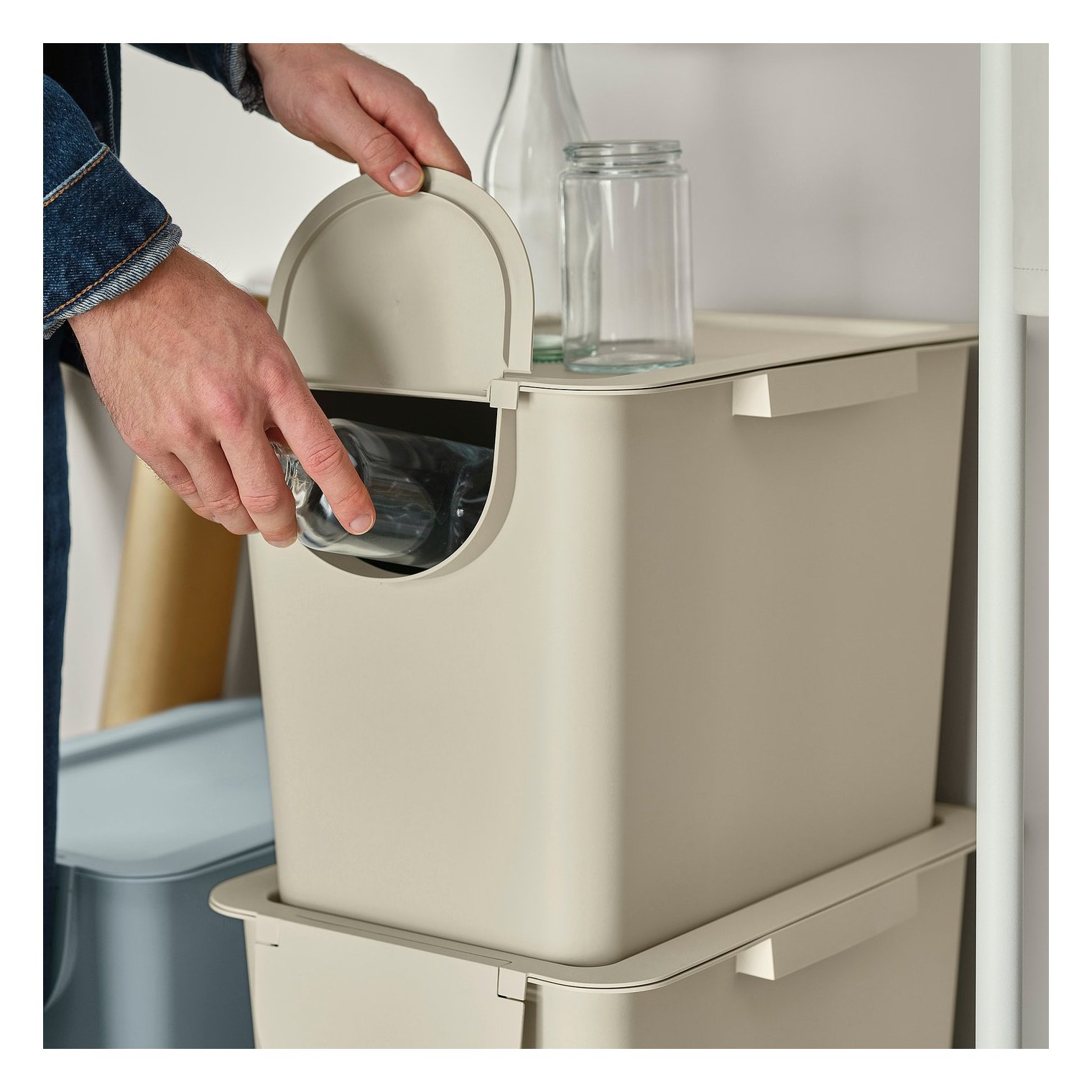 Сміттєвий контейнер TRÖSKNING призначений для сортування сухих відходів, таких як пластик, метал, папір та скло, але ви також можете використовувати його для зберігання садового інвентарю або сумок із покупками.