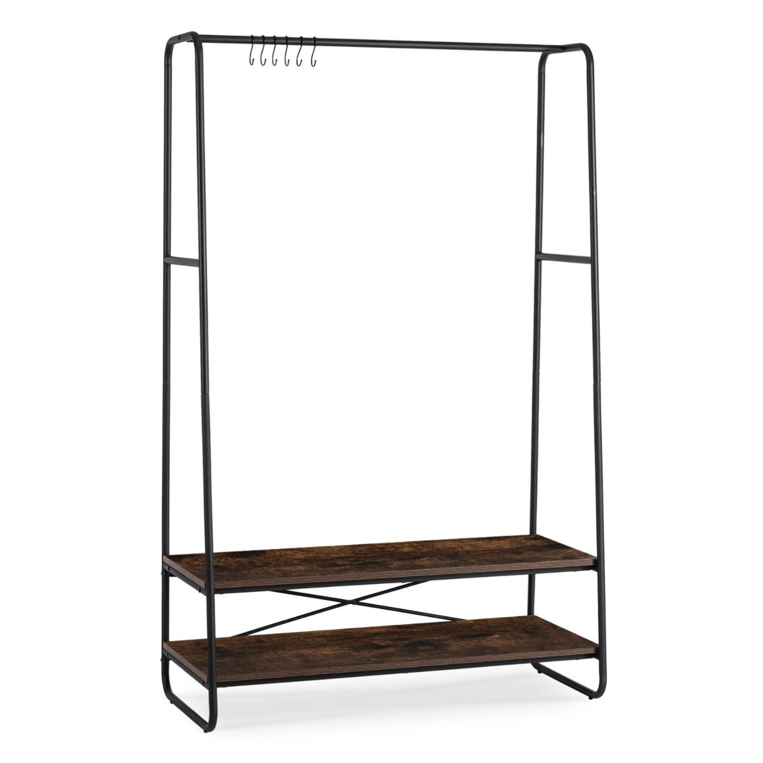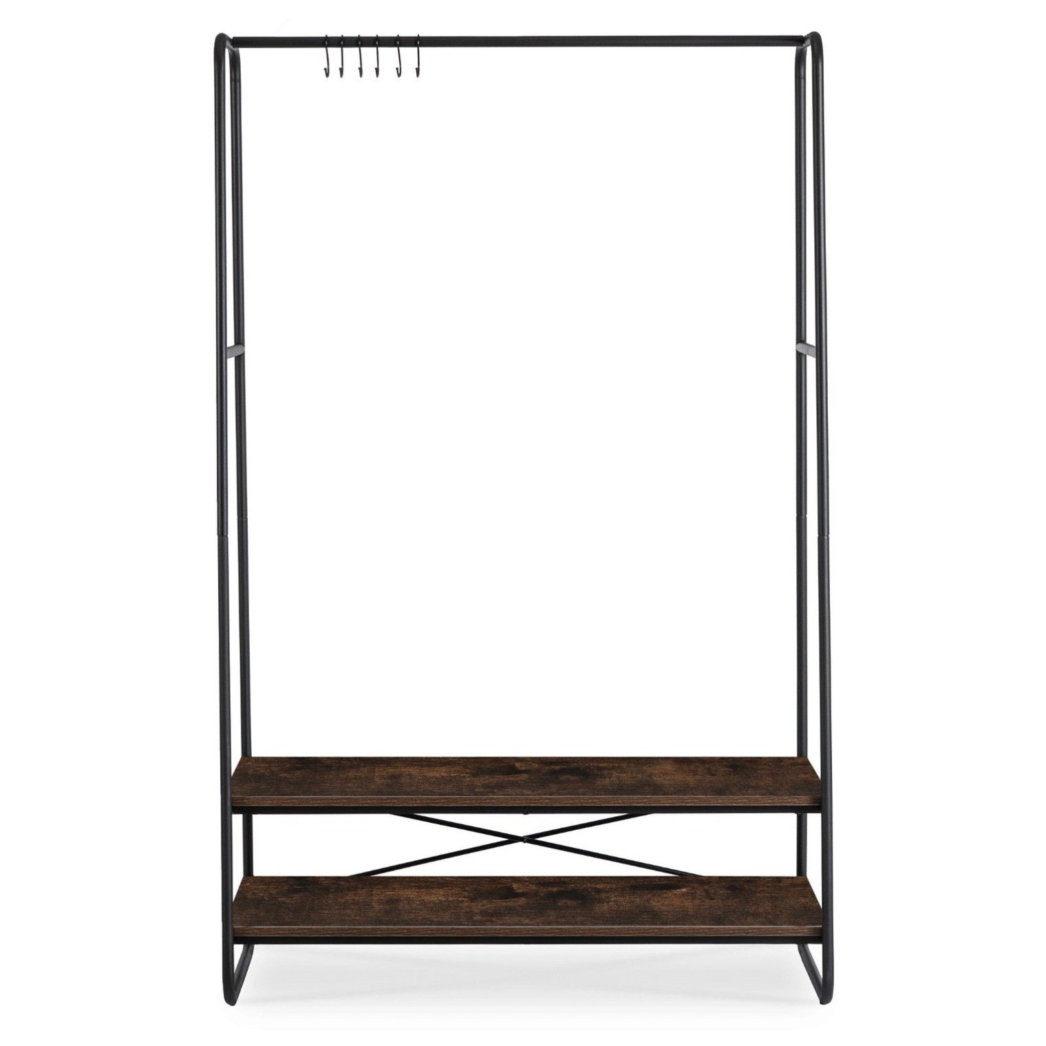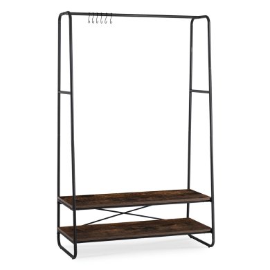 Вішалка для одягу Joel ідеально підійде для передпокою, вбиральні або спальні - скрізь, де необхідне зручне зберігання. Сучасний дизайн, полиці в сільському стилі та сталева рама створюють елегантну вішалку для підлоги, яка допоможе вам стильно підтримувати порядок.