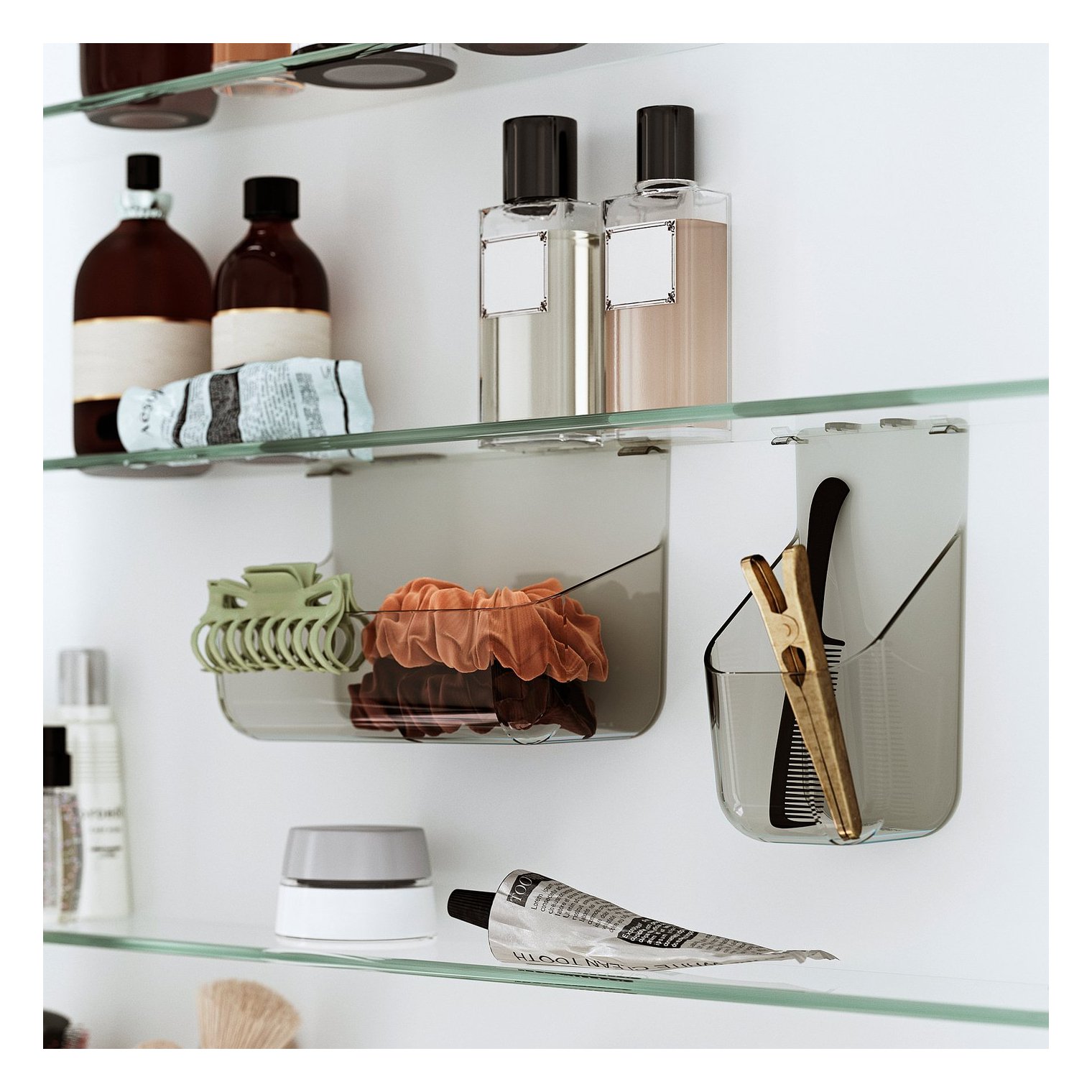 Їх легко повісити на задню частину скляних полиць у стіні або дзеркальній шафі, щоб організувати дрібні предмети та звільнити місце на нижній полиці.