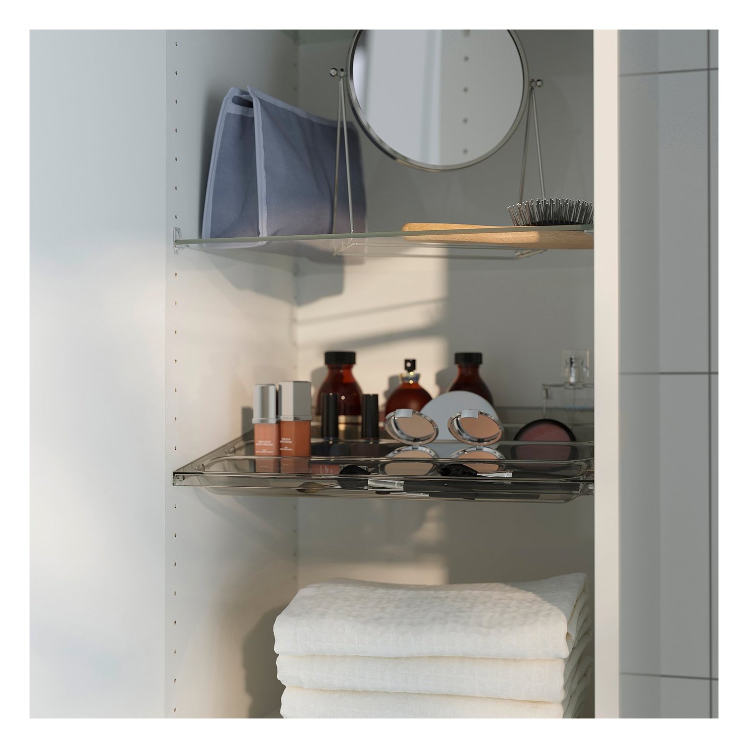Їх можна повісити на гачки або розмістити прямо на полицях у високих шафах серій HAVBÄCK, ÄNGSJÖN або TÄNNFORSEN шириною 40 см. Крім того, їх легко поєднувати з іншими меблями та стилями у вашому будинку.